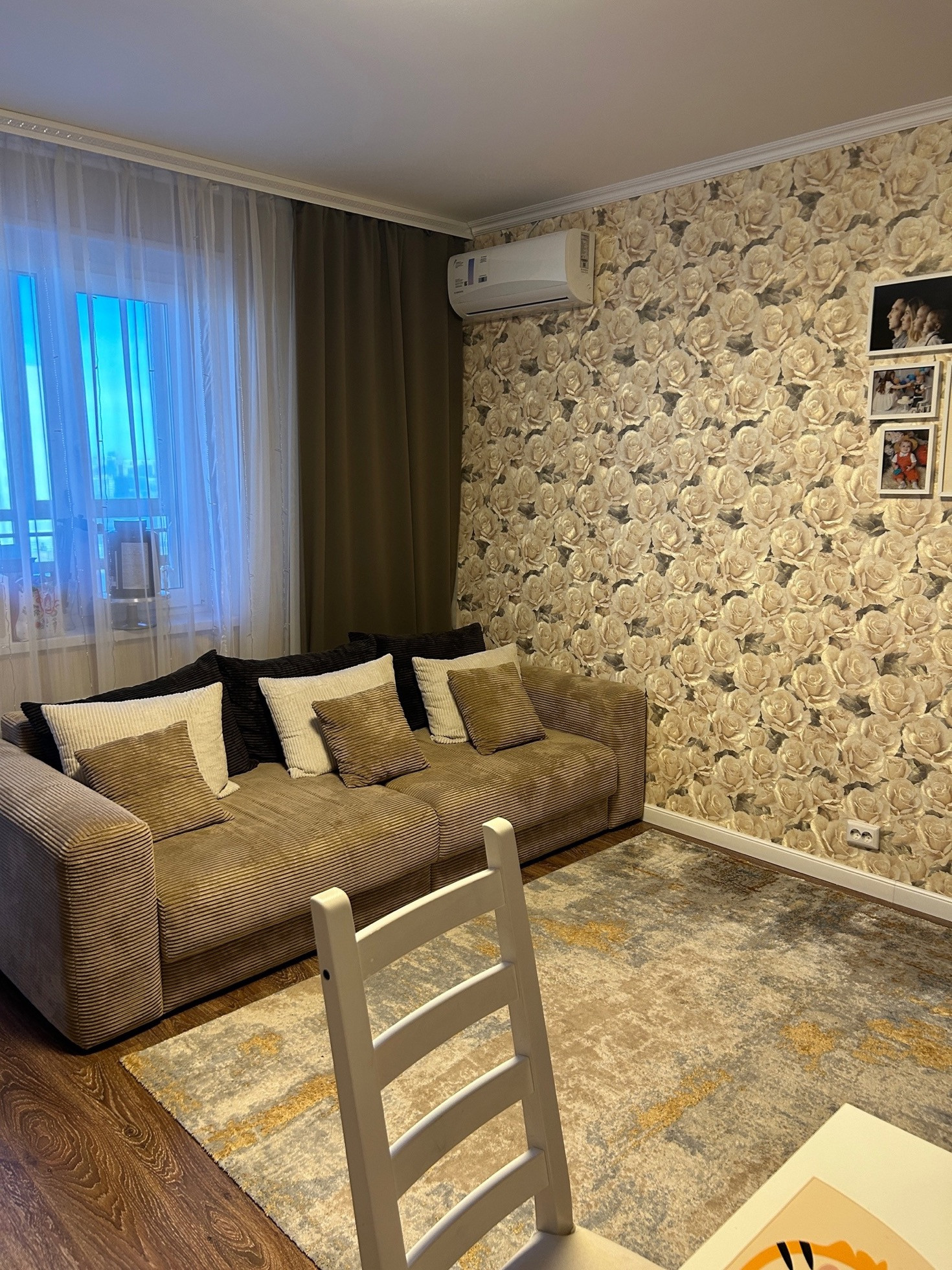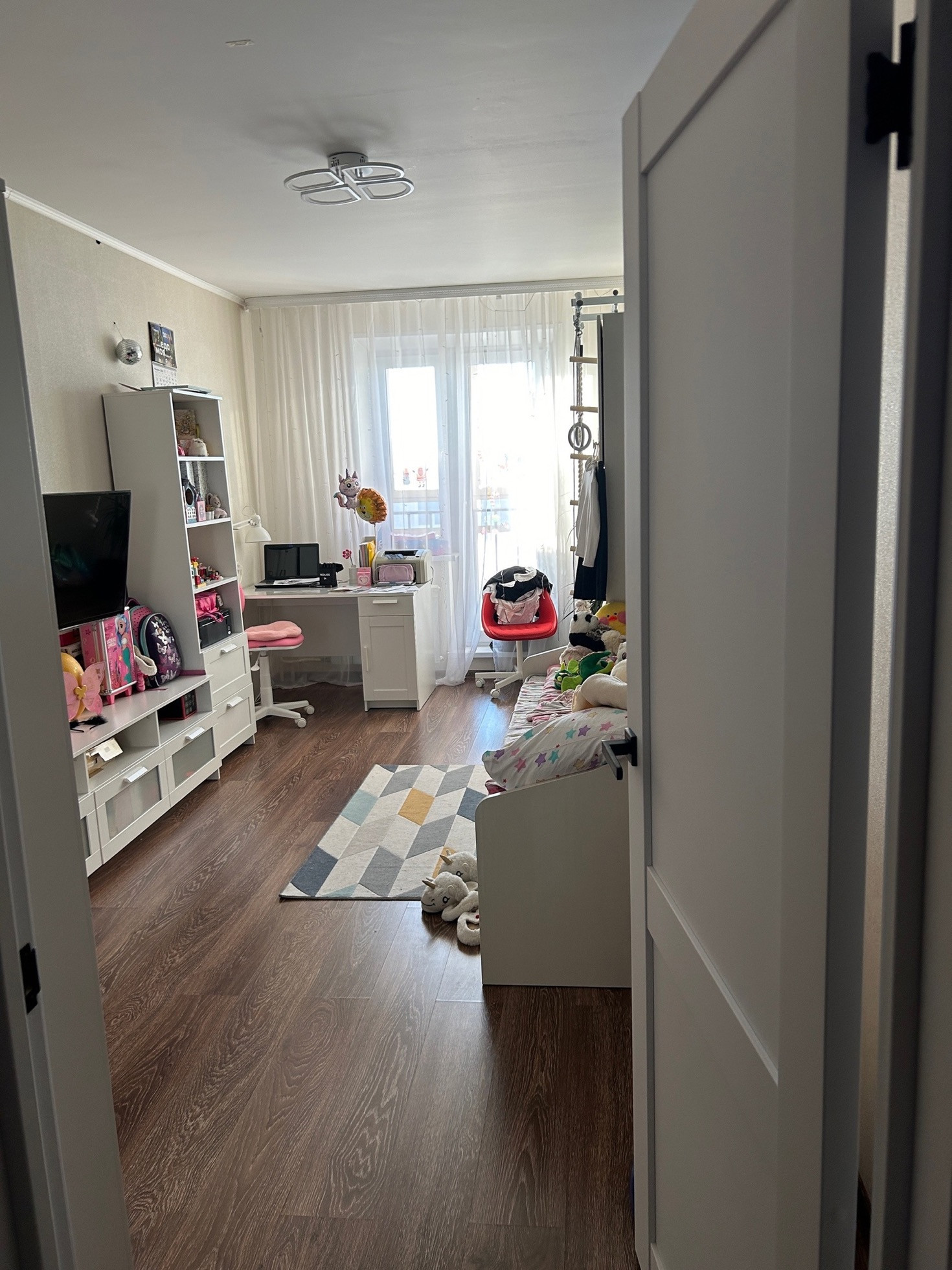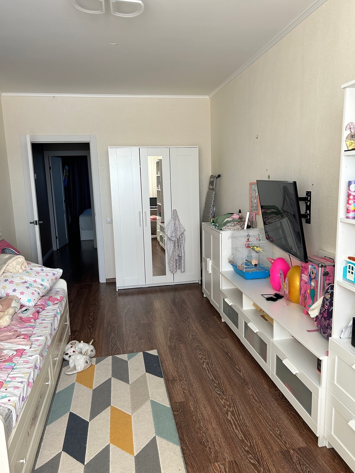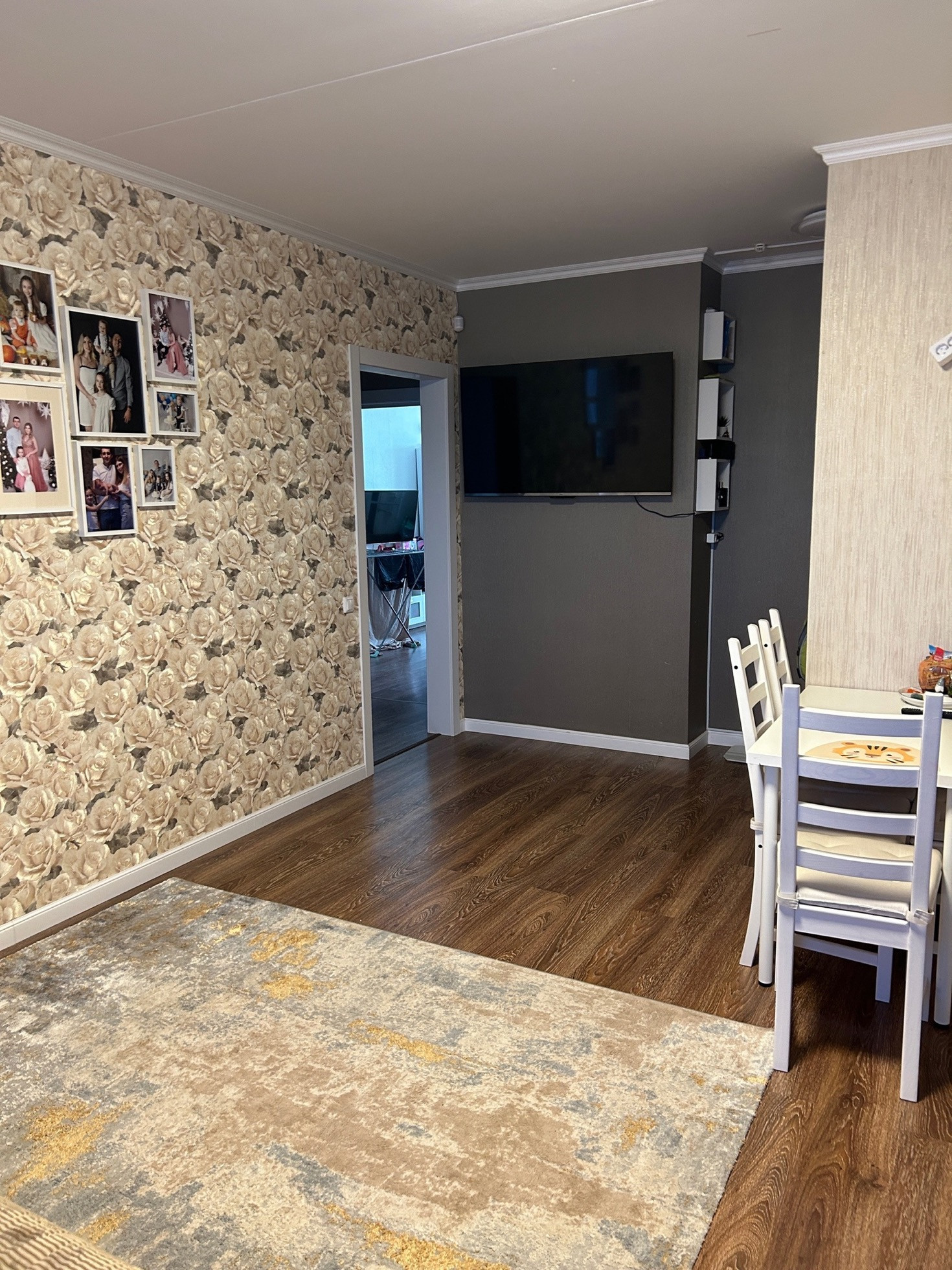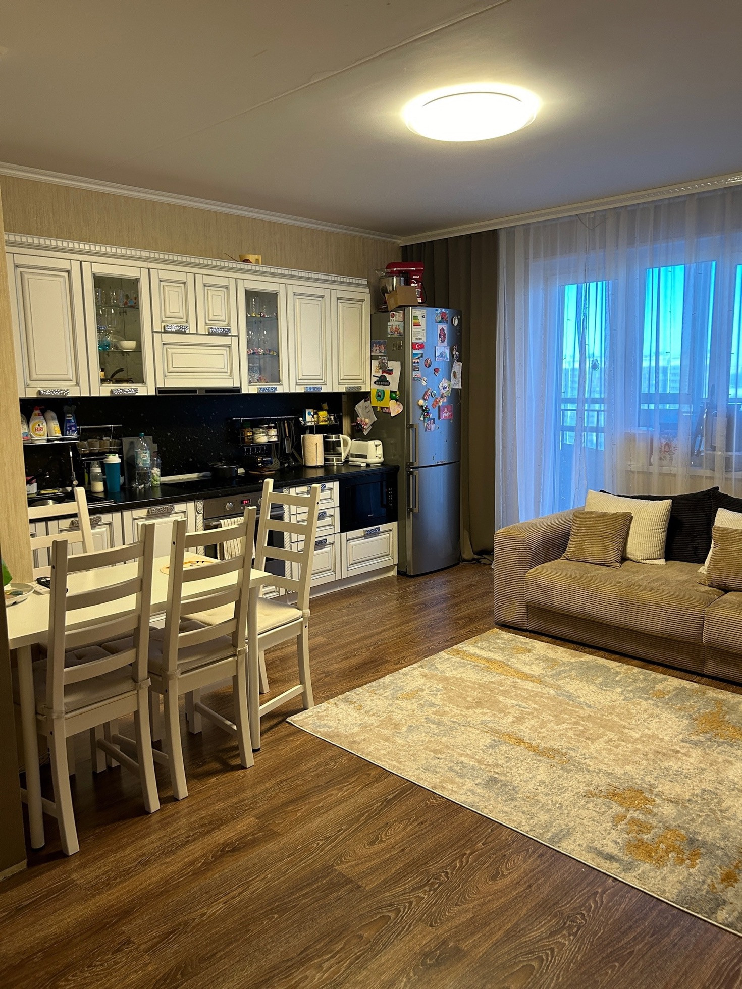 Удобная планировка: комната кухня-студия 17,7 кв.м. с выходом на большой балкон, спальня 8,7 кв.м. с выходом на маленький балкон, и детская комната 16,4 с выходом на балкон. Все 3 балконы застеклены, обшиты деревом. Санузел раздельный, в кафеле Установлен электрический водонагреватель.