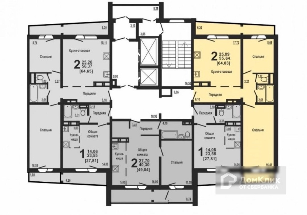 Общая площадь квартиры 64,3 кв.м., 55,6 кв.м. Без учета балконов.