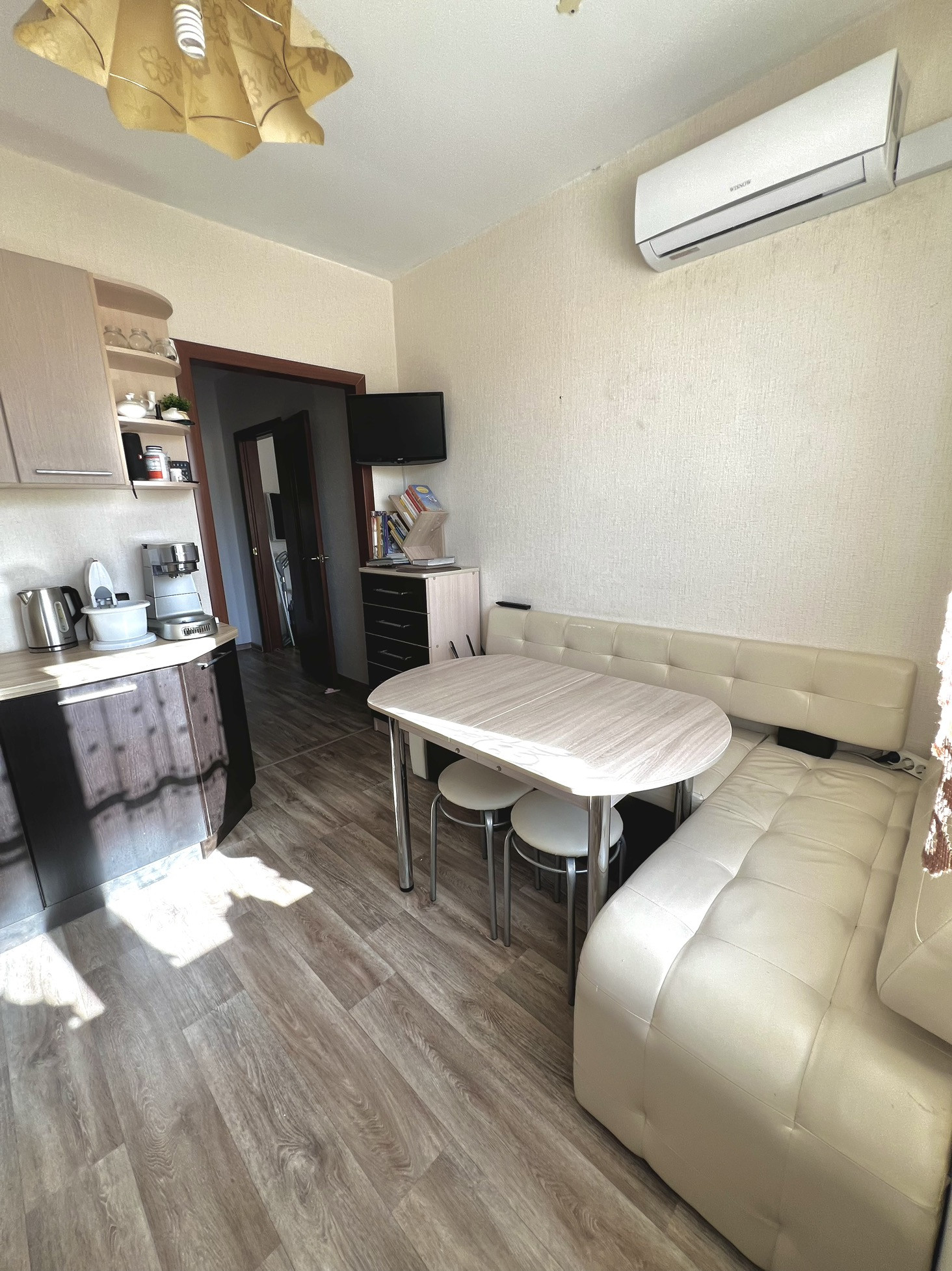 В квартире остается кухня, два встроенных шкафа (в коридоре и в комнате). Диван, тумба под телевизор, комод в комнате, плита и вытяжка по договоренности.