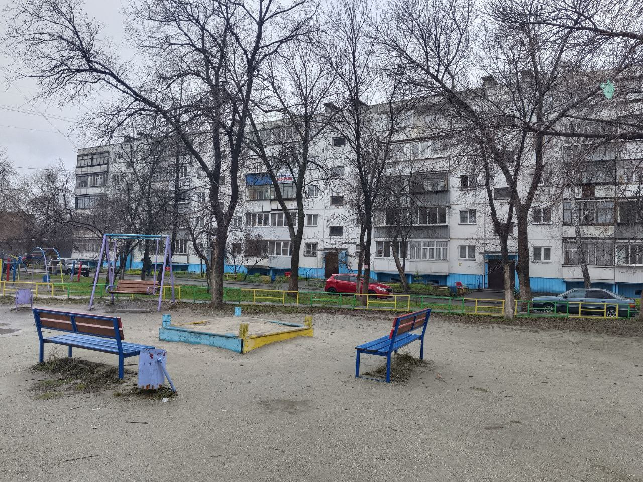 Двор просторный, есть детская площадка.