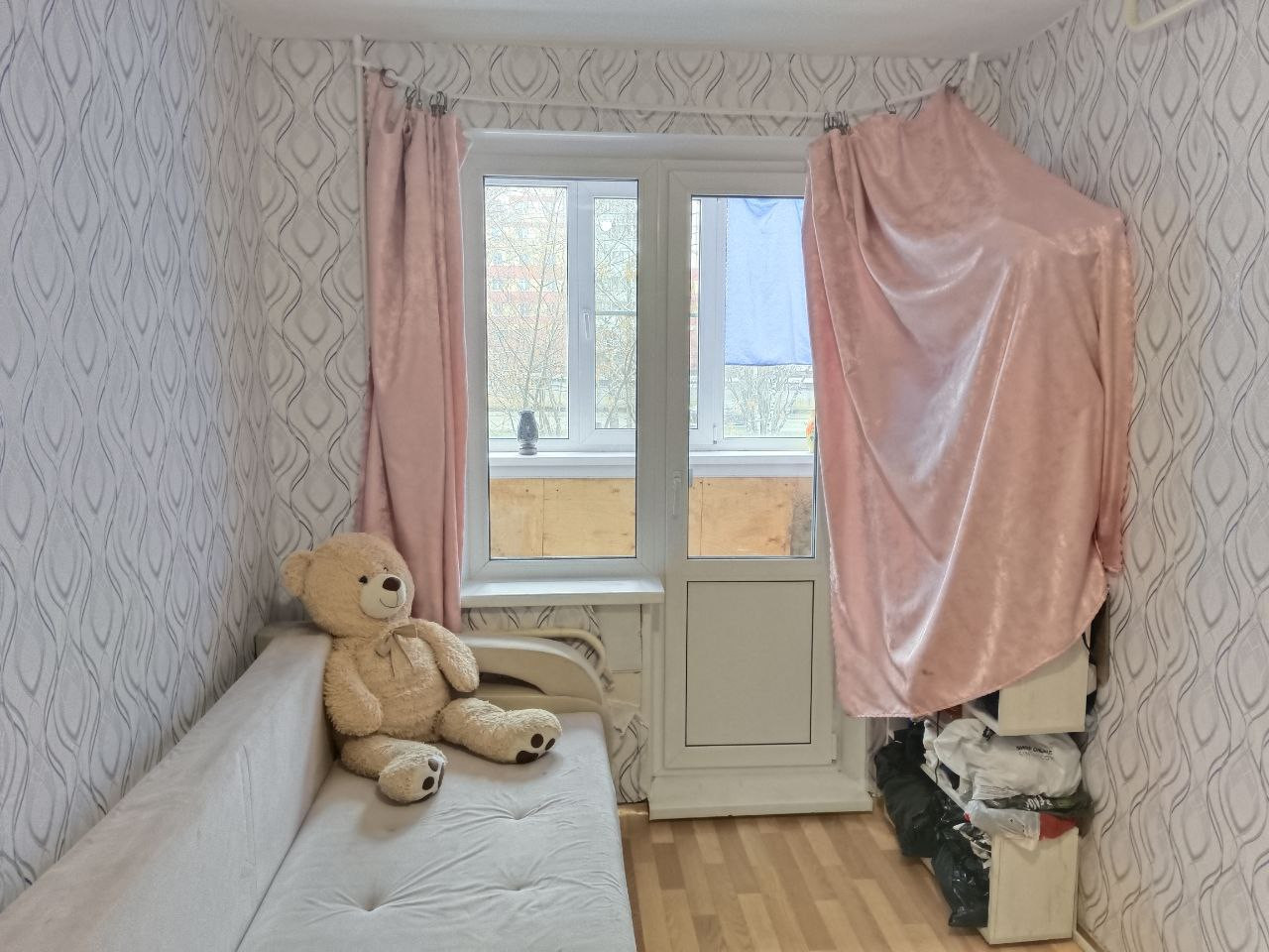 В квартире обои, линолеум, потолок оштукатурен, окна и балкон с евро остеклением.
