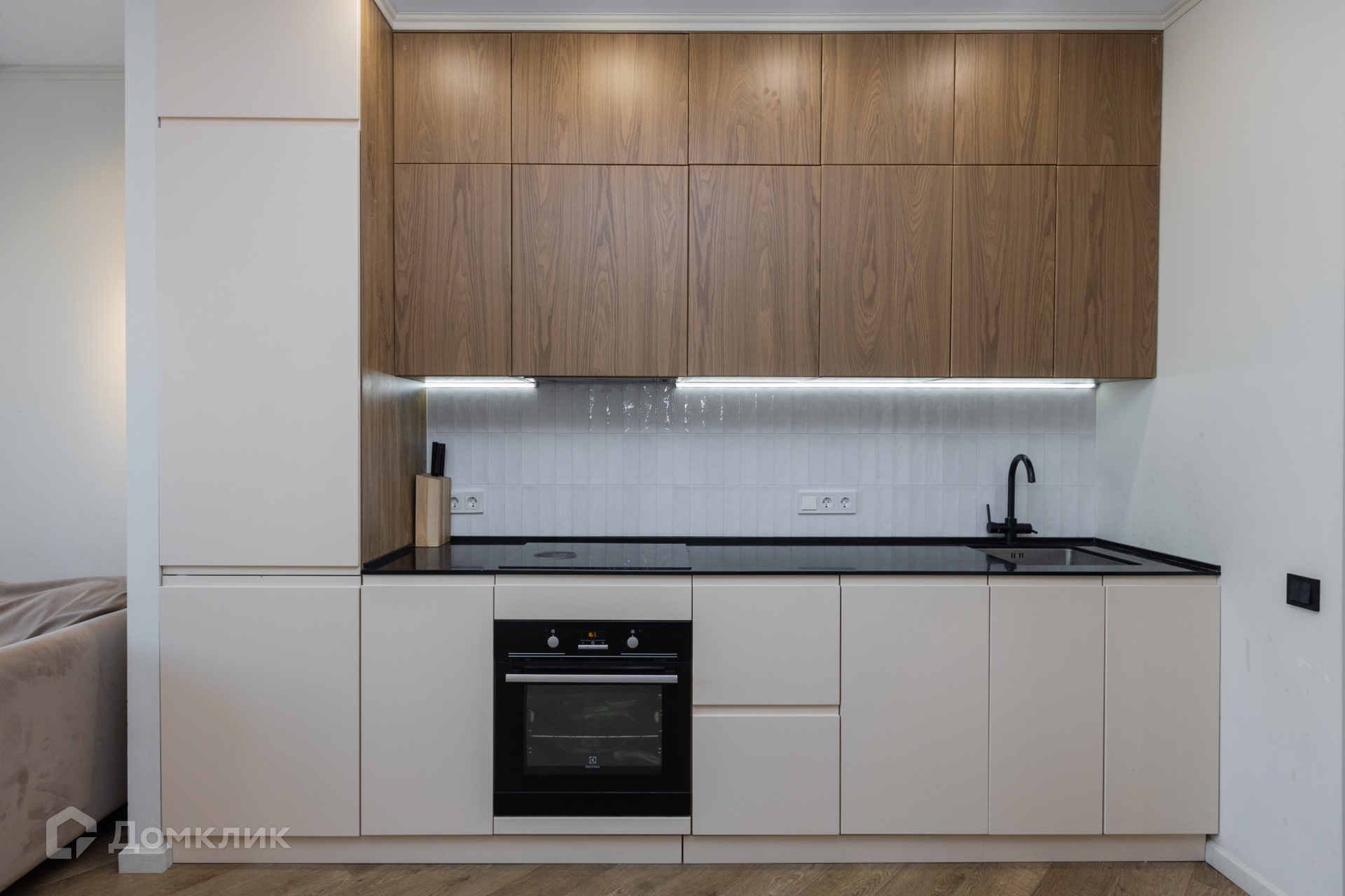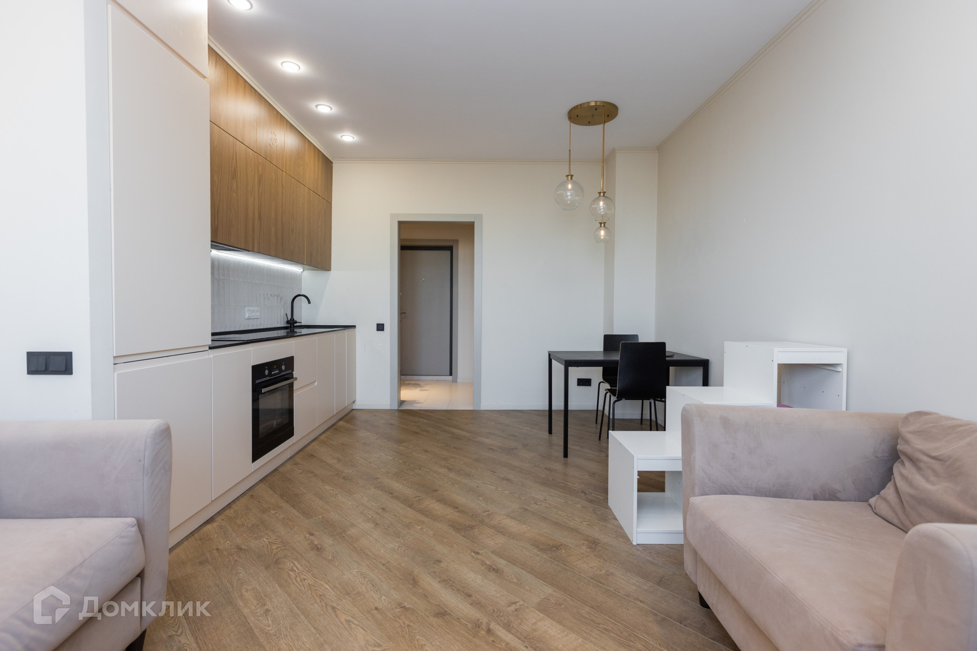 Большая кухня-студия площадью 20,4 кв.м. В ней остается дорогой кухонный гарнитур со столешницей из искусственного камня, качественной сантехникой и встроенной техникой: индукционная плита, духовой шкаф, посудомоечная машинка, вытяжка, холодильник. Так же в студии имеется стильная обеденная зона, зона отдыха с диваном, креслом и плазменным телевизором.