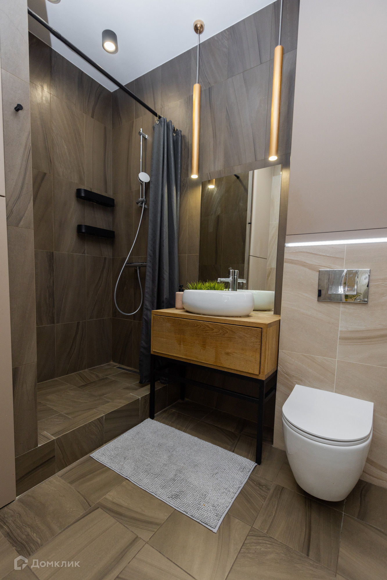 В ванной полы с подогревом, покрытие из керамогранита. Установлена сантехника марки Hansgrohe, имеется водонагреватель и стиральная машина.
