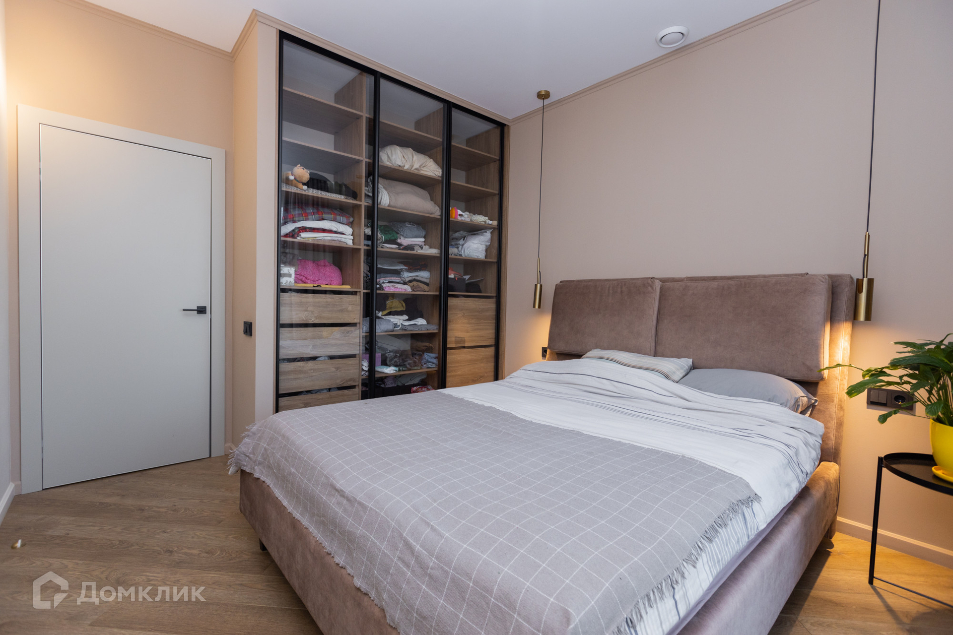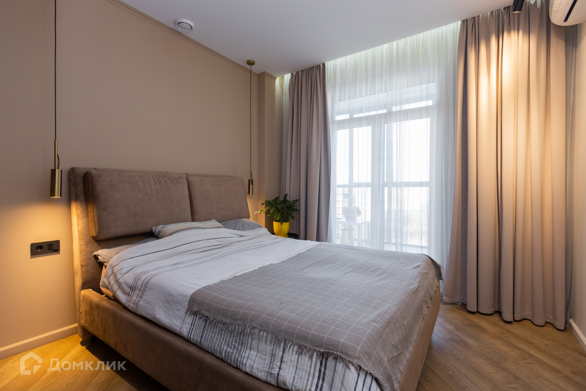 В уютной стильной спальне площадью 12,2кв.м. находится большая двуспальная кровать с матрасом и вместительный шкаф во всю стену. Есть подвесные лампы для чтения. Из спальни "Французский выход" - панорамная двустворчатая дверь на большую панорамную лоджию с шикарным видом на лес и высотки центра города. В лоджию проведено освещение, сделан пол с покрытием из кварцевого морозоустойчивого ламината.