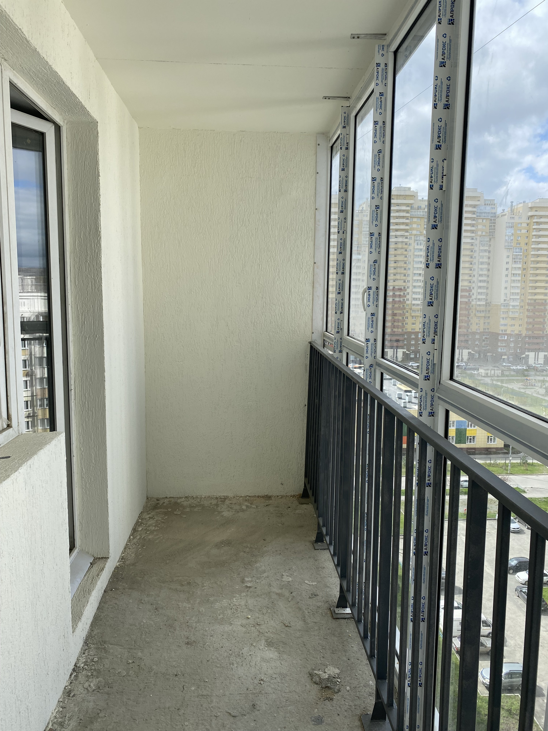 Балкон во всю длину комнаты (6,5 кв.м.), очень широкий, остеклен (евро/панорамное остекление).