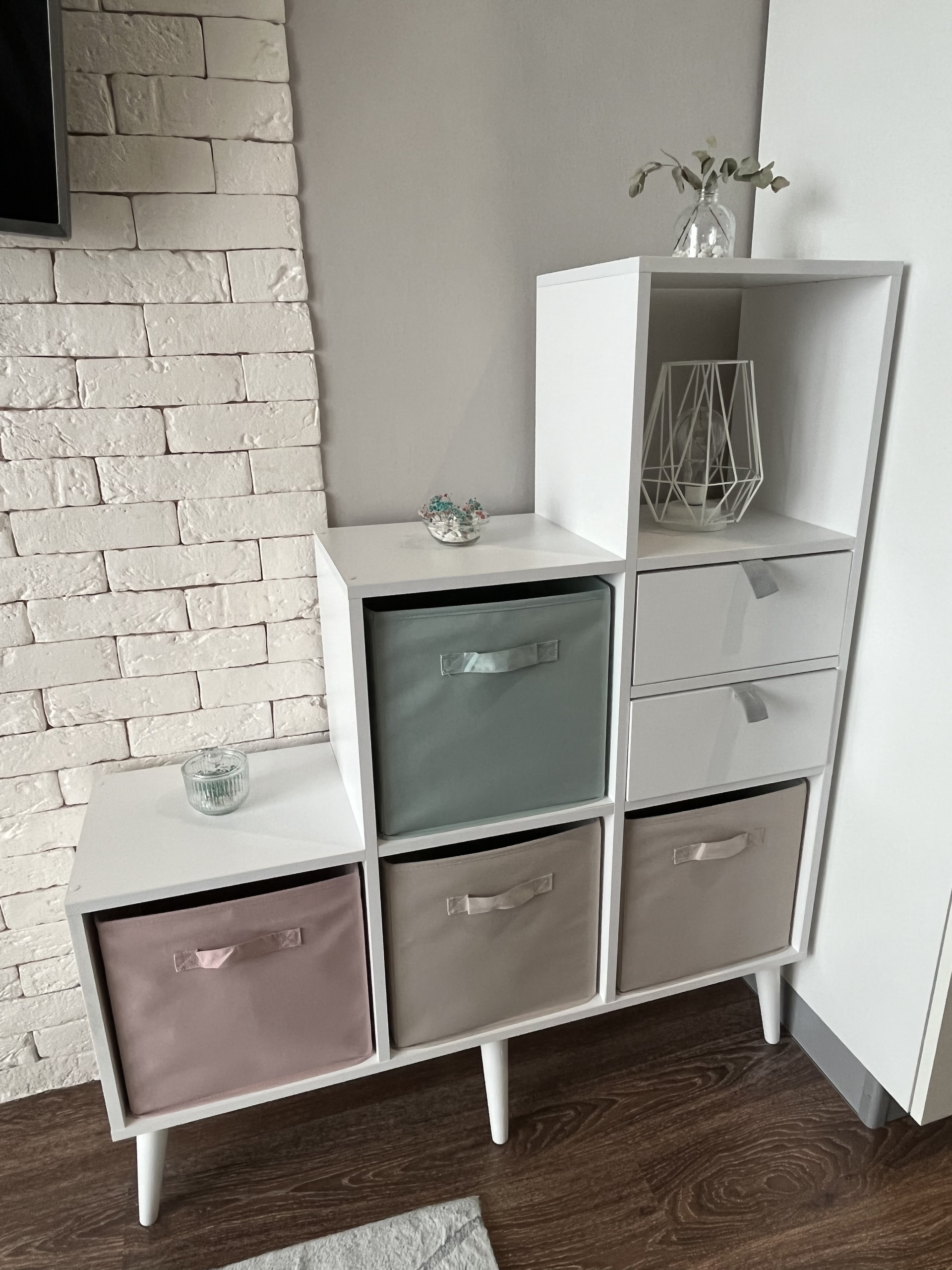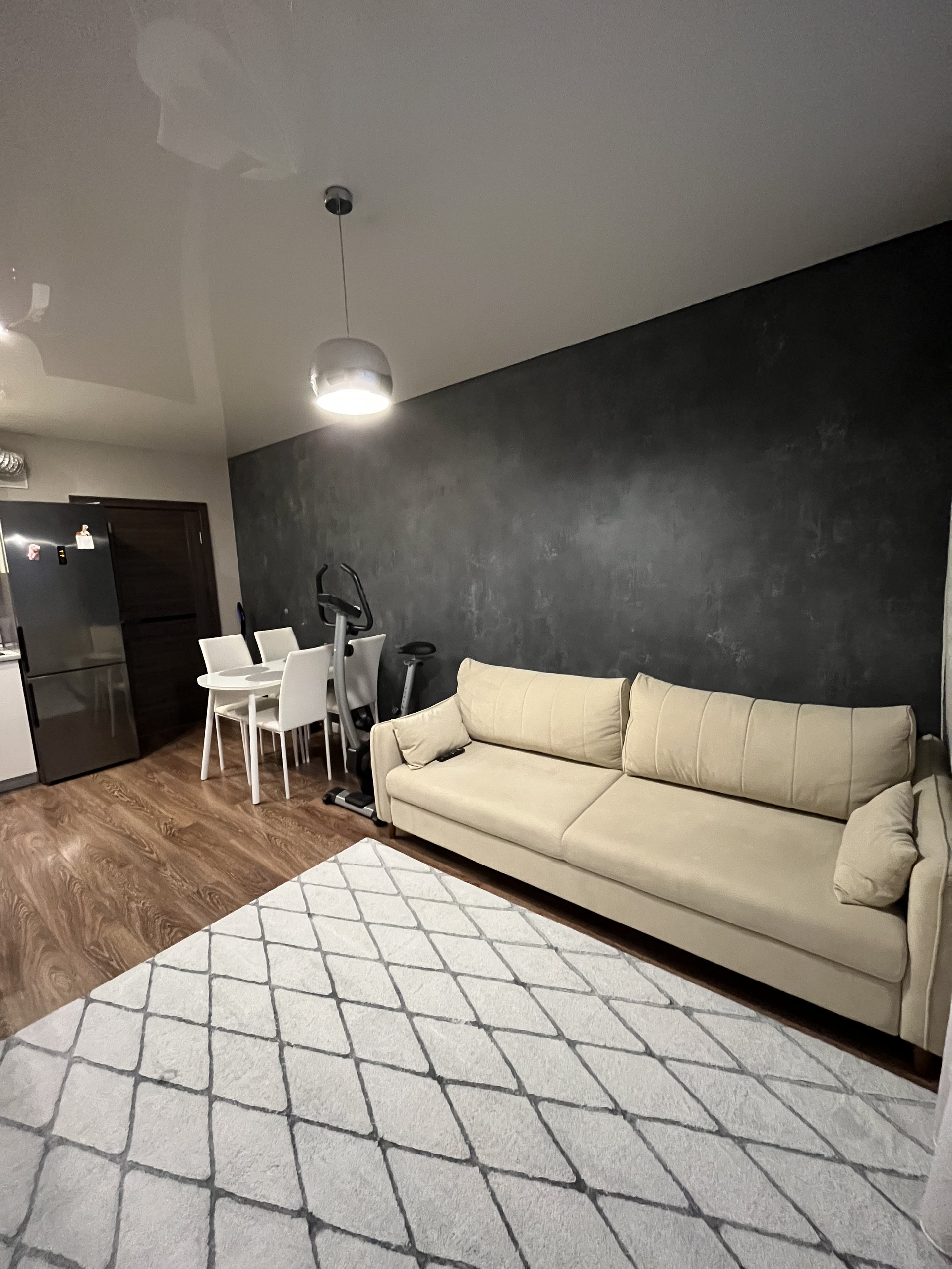 На стенах в прихожей и на одной стороне стены в студии выполнена отделка декоративной штукатуркой.