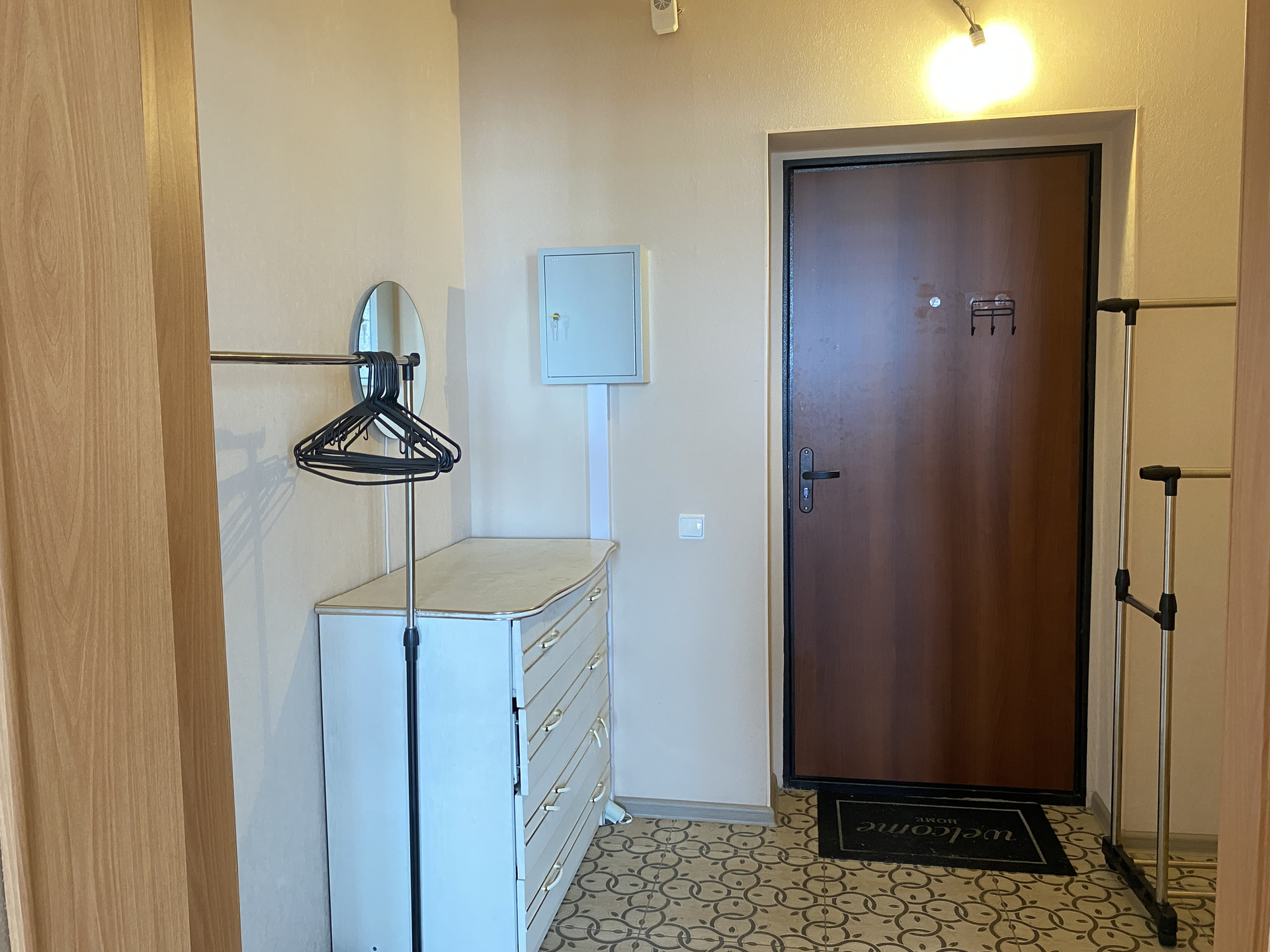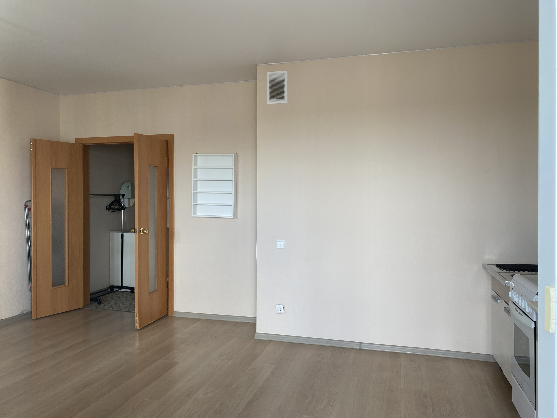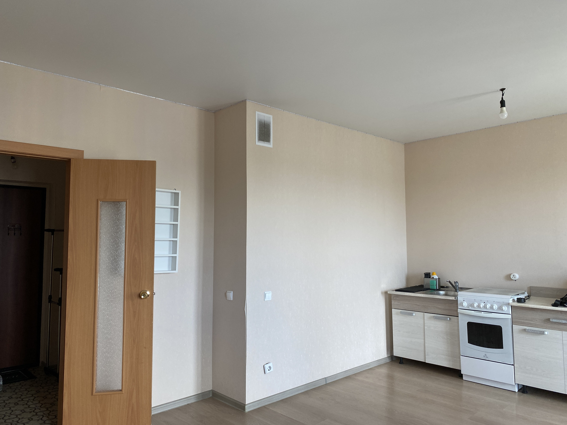 В квартире натяжные потолки, плитка в санузле, напольная плитка в коридоре, обои. Установлена электроплита, счетчик в квартире.