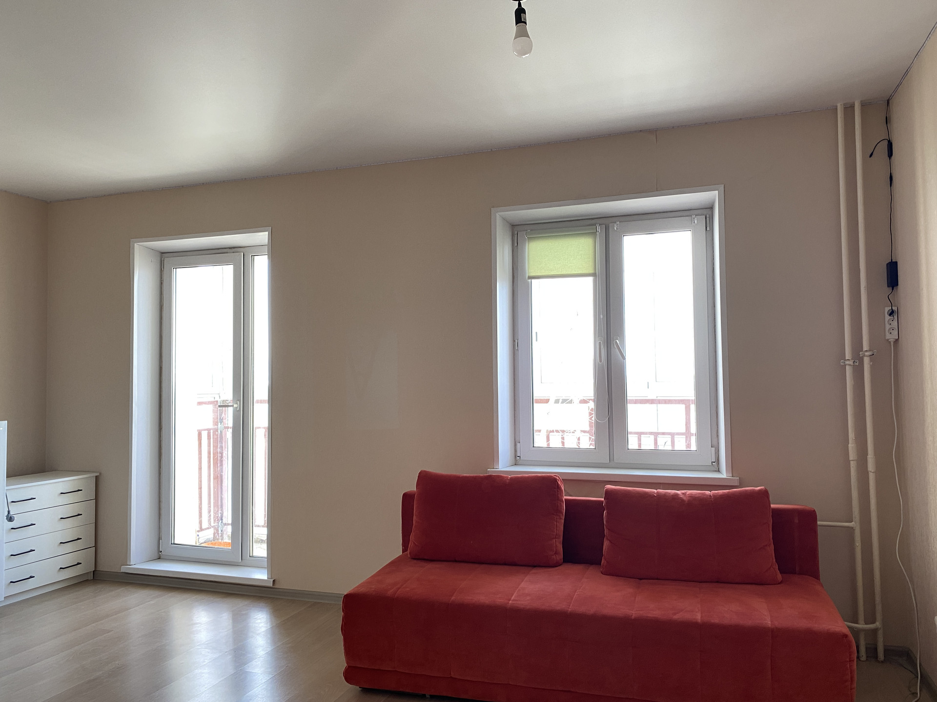 Просторная светлая студия с панорамным балконом и двумя окнами: Гостиная 22 кв.м., коридор 5,2 кв.м., совмещенный санузел 5 кв.м.