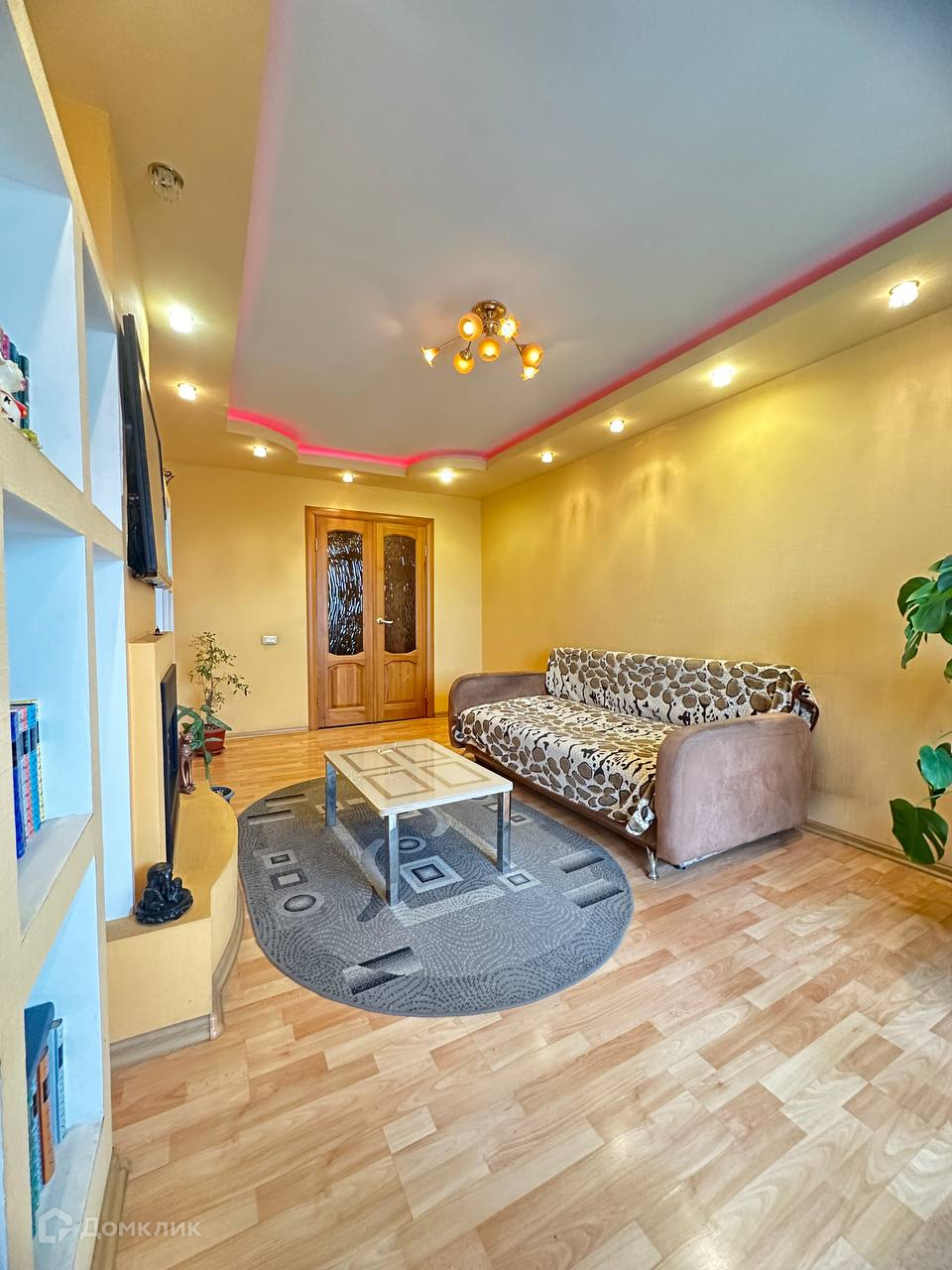 B залe установлен двухуровневый потолок с подсветкой.