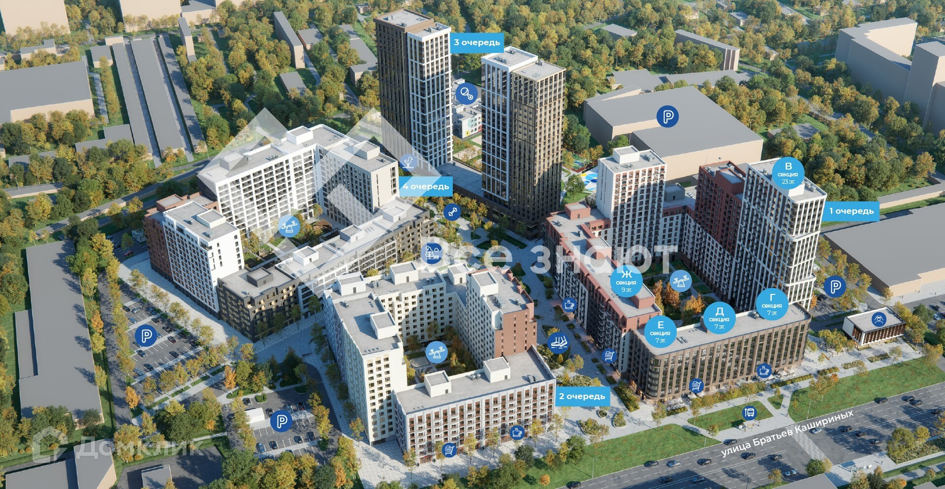 Жилой квартал Голос Кашириных состоит четырех монолитно-каркасных домов переменной этажности от 7 до 23 этажей с подземным паркингом и кладовыми на первом подземном этаже каждого дома.