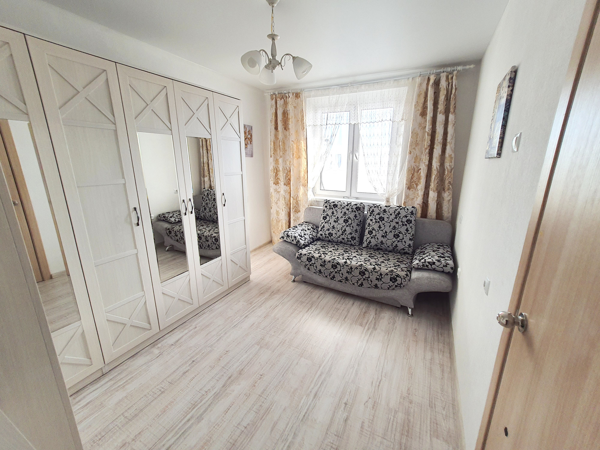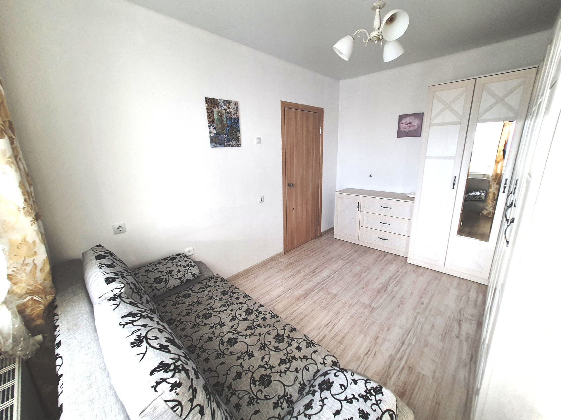 - в спальне: плательный угловой шкаф, комод, новый (!) диван, люстра, настенный декор, шторы;