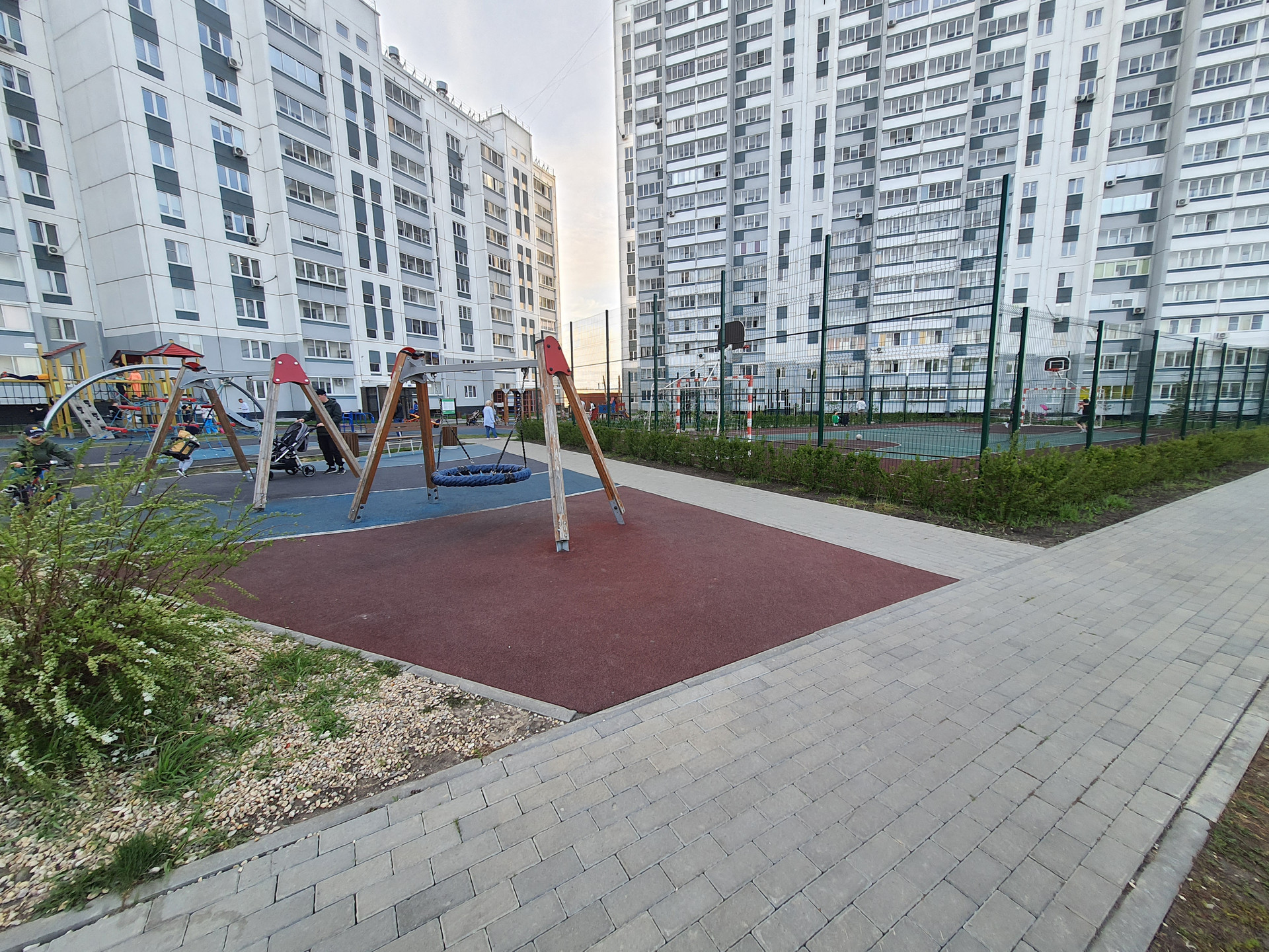 Современная детская площадка с мягким покрытием, интересными современными горками и качелями, баскетбольная сетка, канадский газон с автополивом, где дети устраивают пикники, красивые клумбы.
