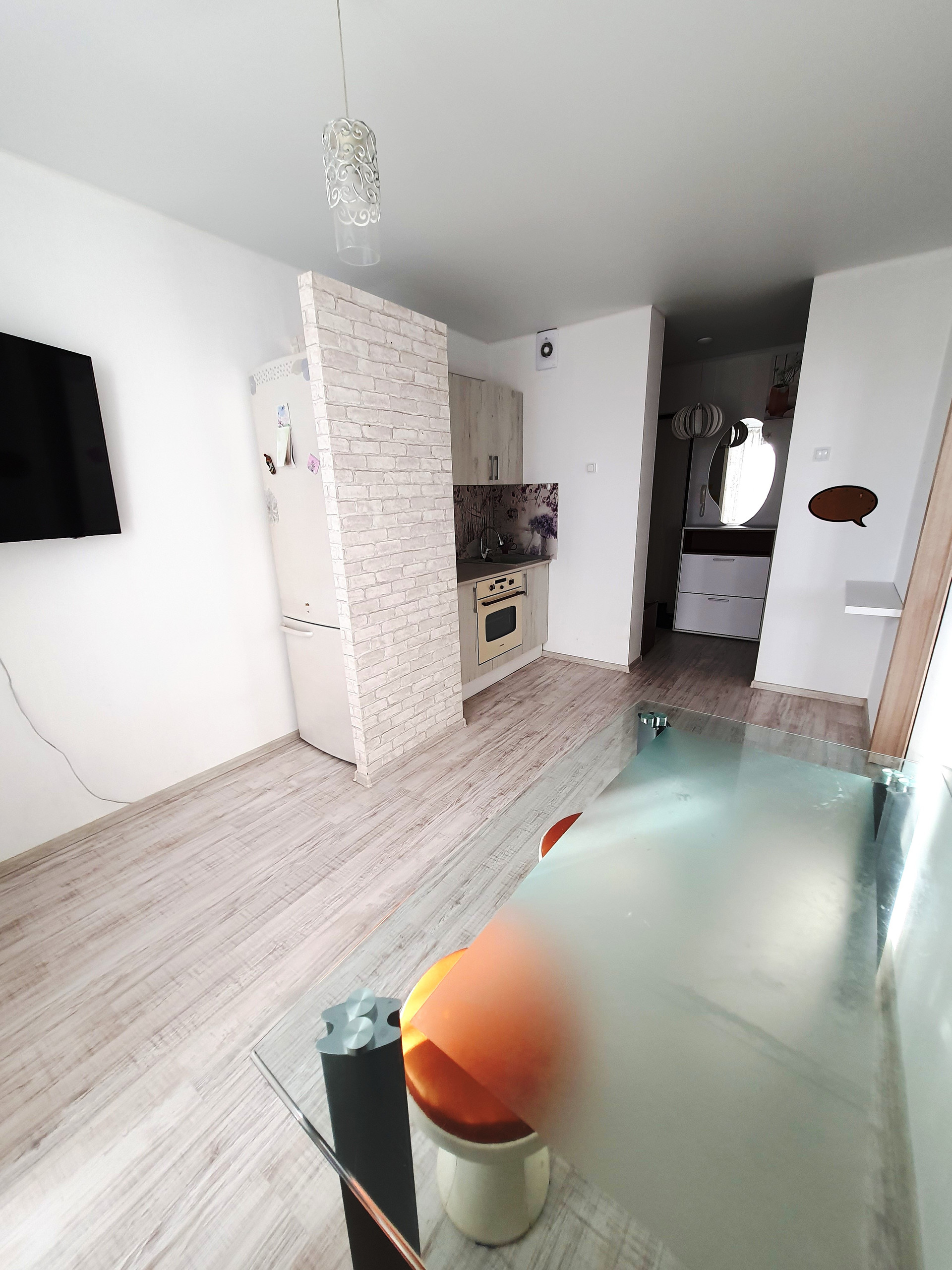- в кухне-гостиной: кухонный гарнитур и кухонная бытовая техника (варочная панель, духовой шкаф), холодильник, стол и пуфы, люстра, настенный декор, шторы;