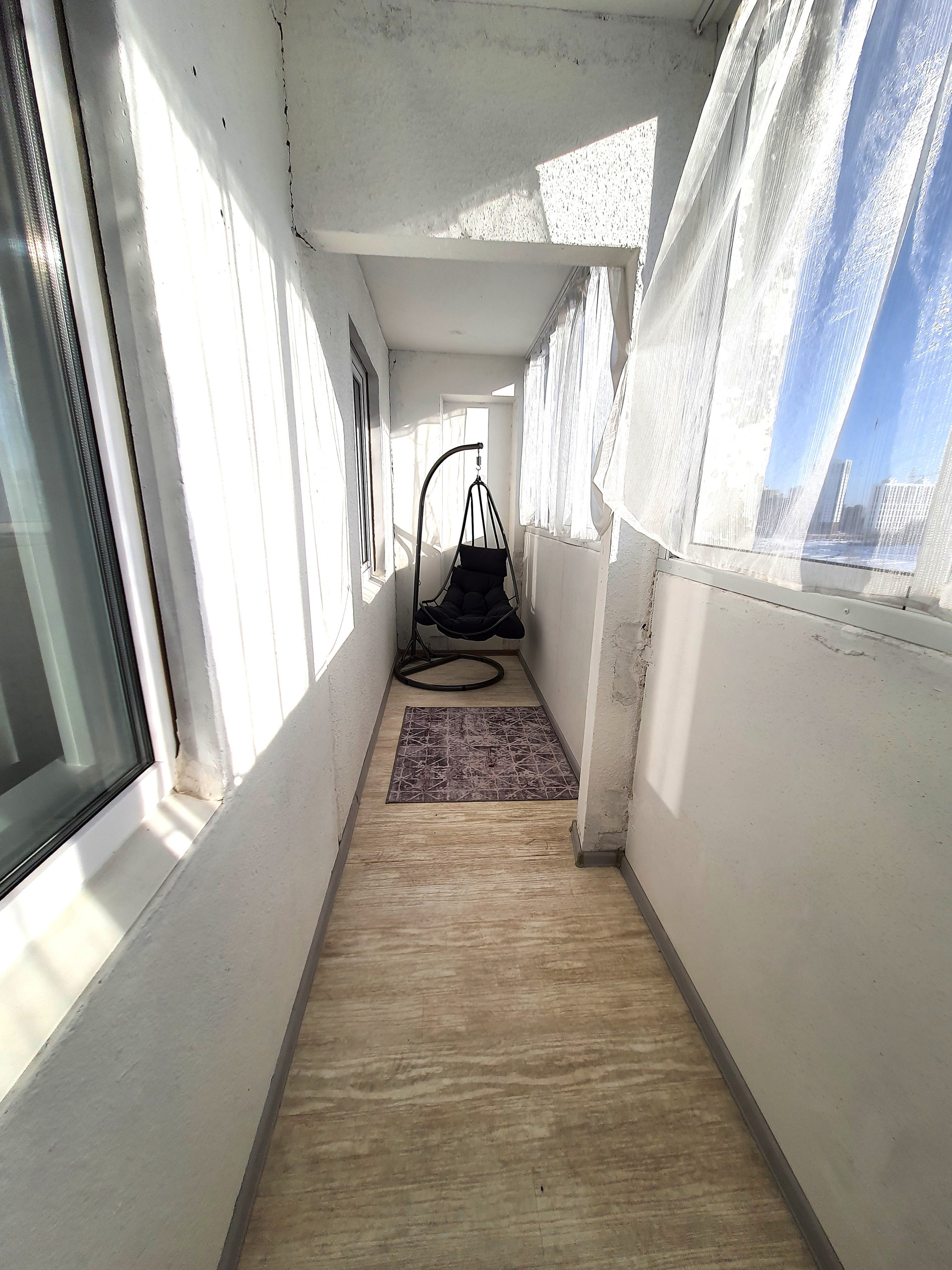 Свежий ремонт также выполнен и на лоджии: остекление окон, постелен линолеум, стены оштукатурены.