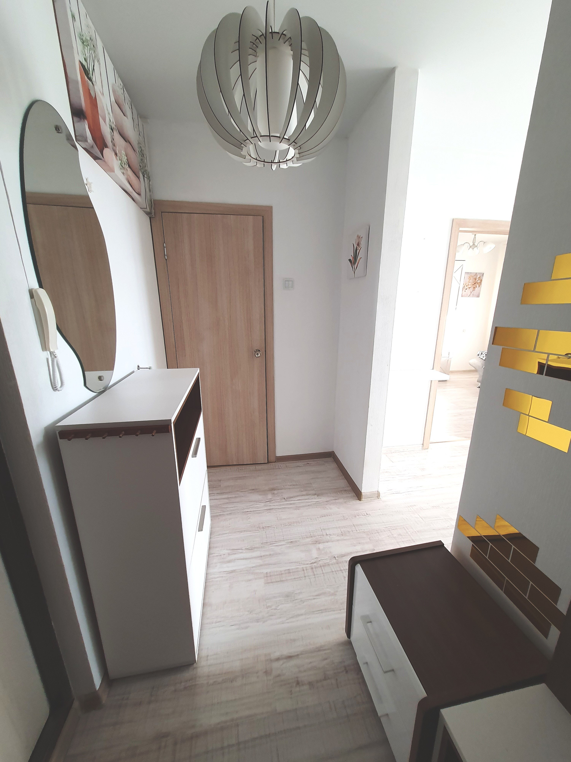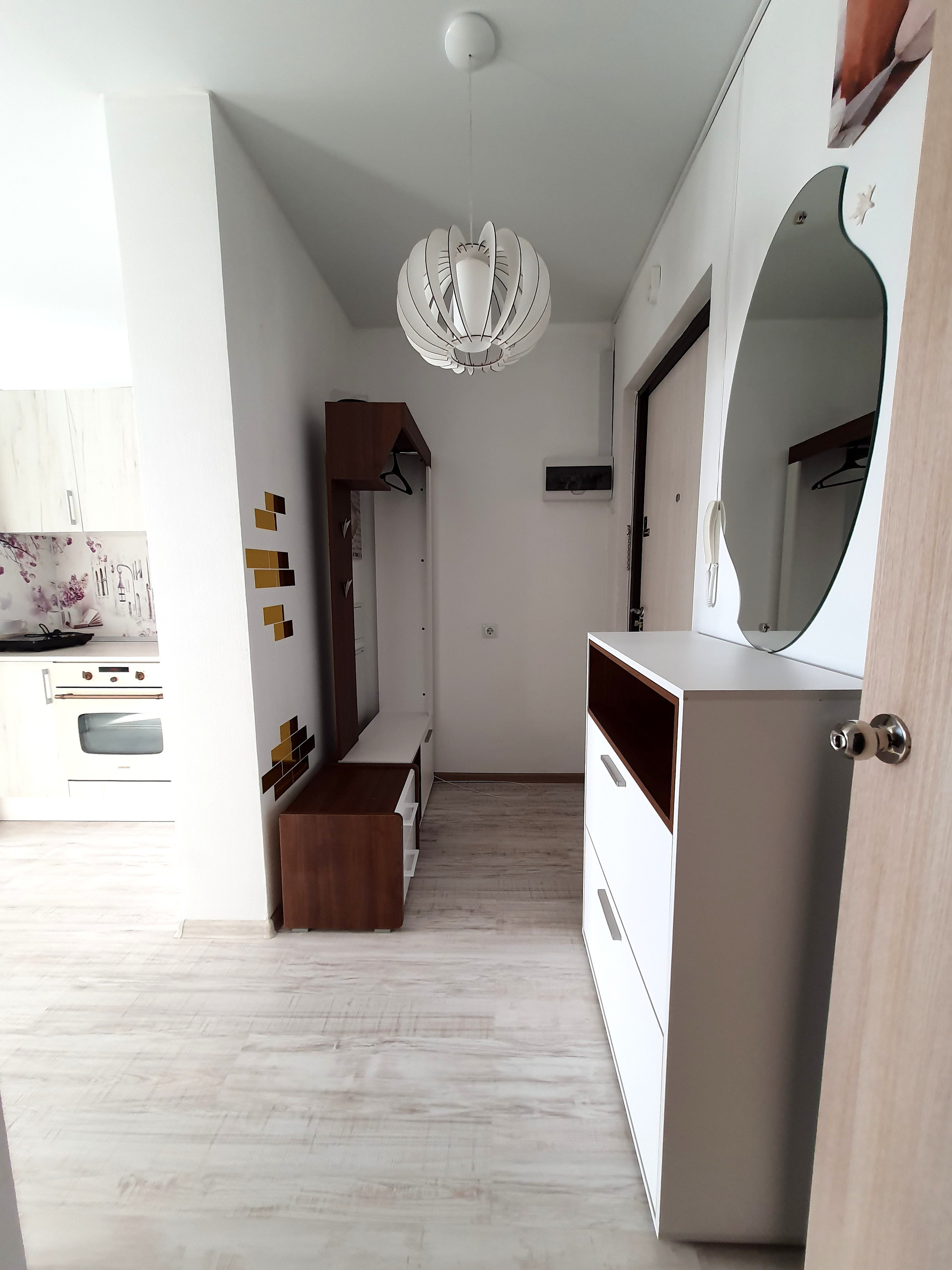 - в прихожей: шкаф-гардероб для верхней одежды и обуви, зеркало, люстра, настенный декор;
