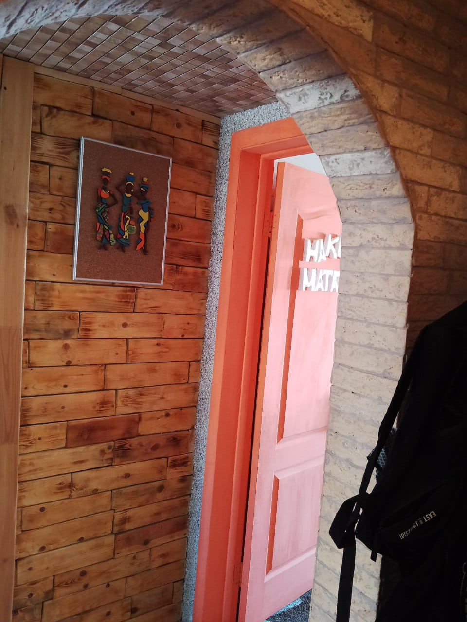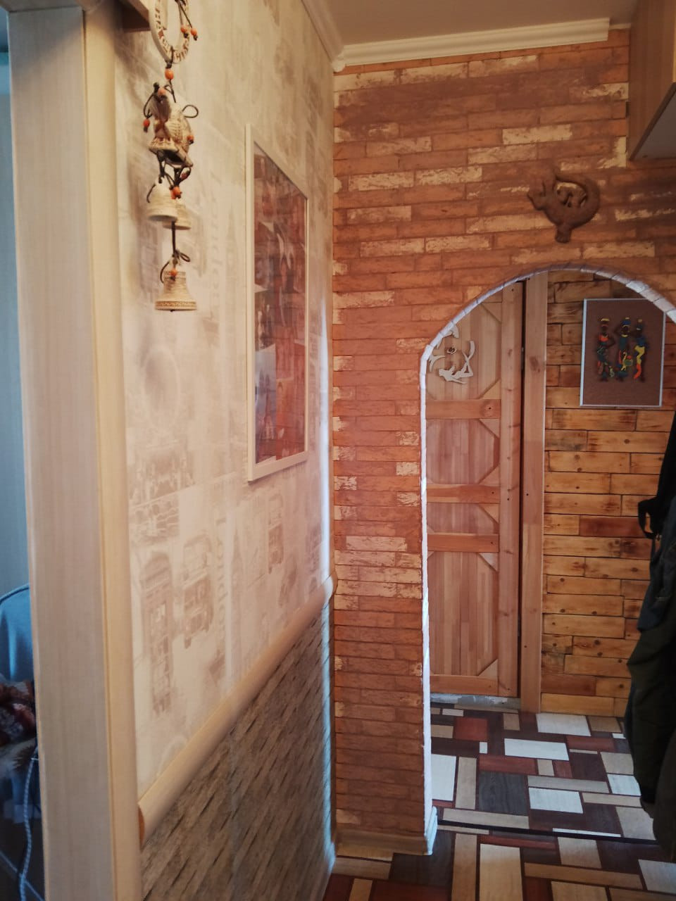 -коридор отделан красивой плиткой и натуральным деревом.