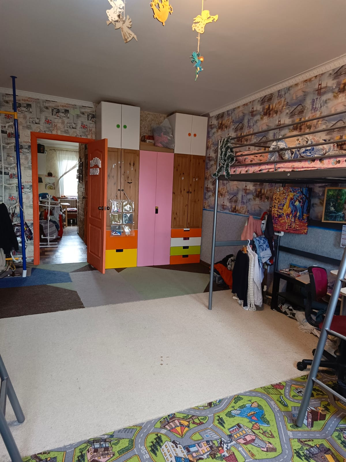 -детская отделана тематическими обоями на полу теплый ковролин,