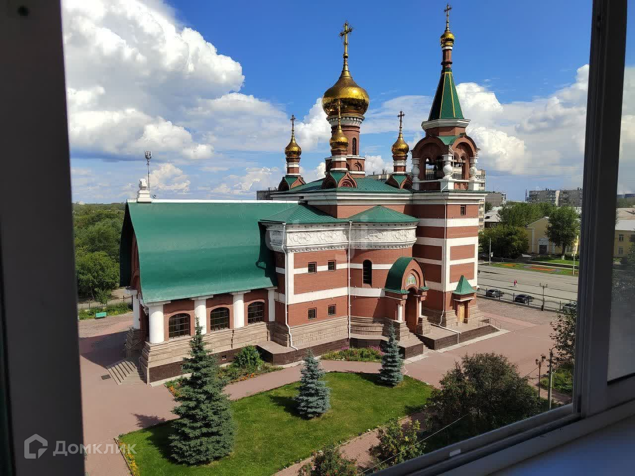 Красивый вид из окна во двор и на храм.