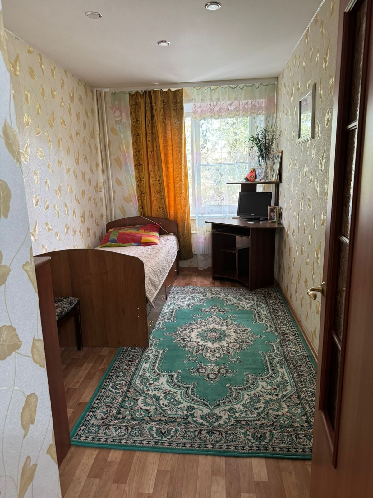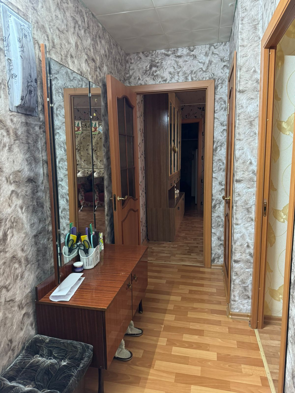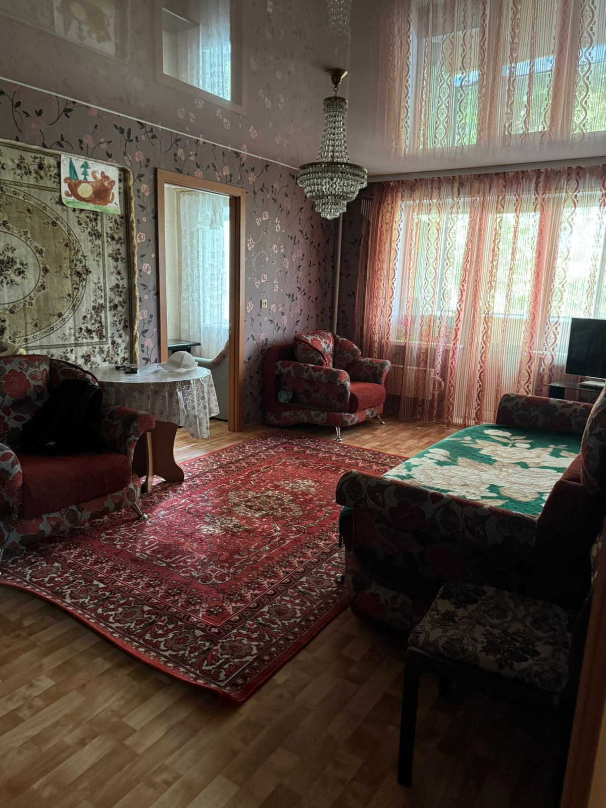 Состояние хорошее, заменены окна, межкомнатные двери, натяжные потолки,  новая сантехника, установлены счётчики на воду и газ, установлена газовая колонка, горячая вода  круглый сезон, не зависимо от плановых отключений. Остаётся кухонный гарнитур. Чистая, светлая, уютная квартира. Отличные, тихие соседи.