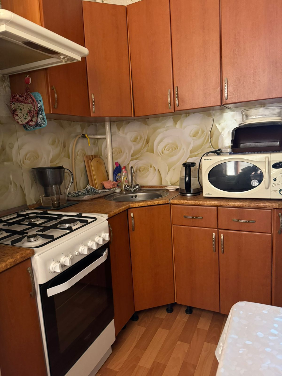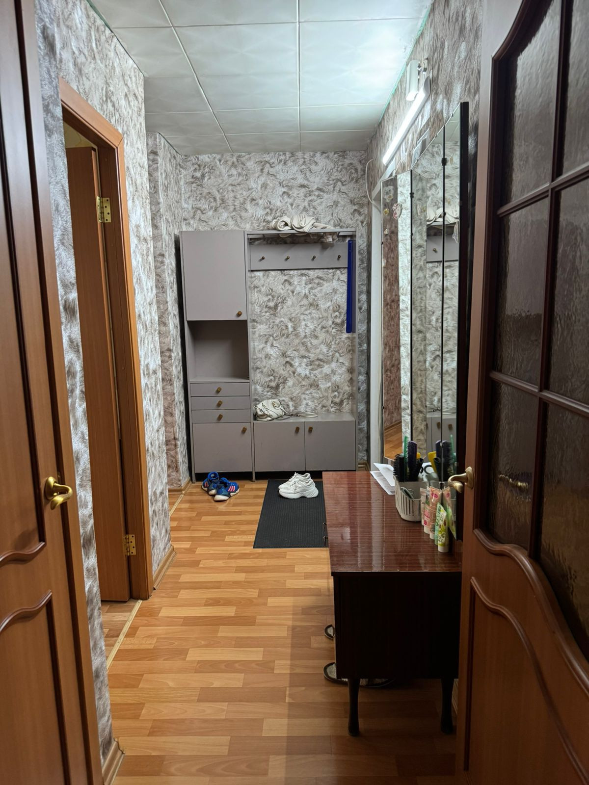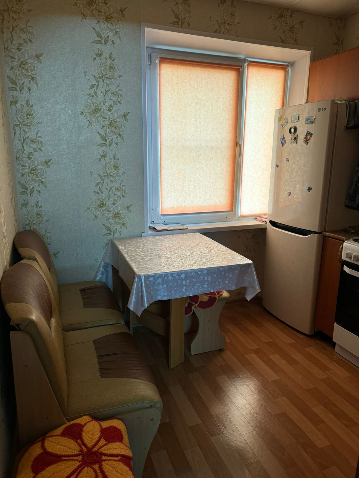 Состояние хорошее, заменены окна, межкомнатные двери, натяжные потолки,  новая сантехника, установлены счётчики на воду и газ, установлена газовая колонка, горячая вода  круглый сезон, не зависимо от плановых отключений. Остаётся кухонный гарнитур. Чистая, светлая, уютная квартира. Отличные, тихие соседи.
