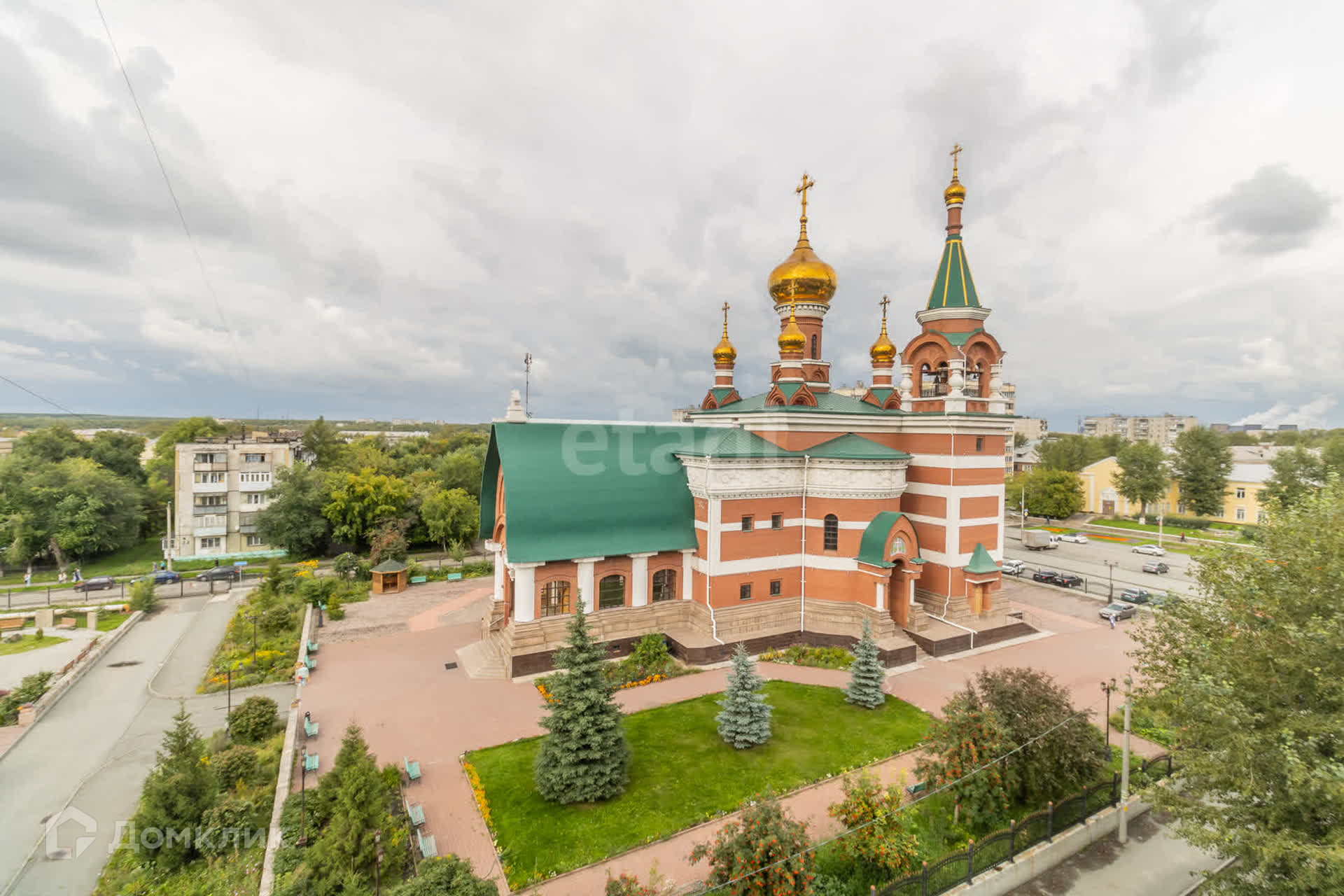 Красивый вид из окна во двор и на храм.