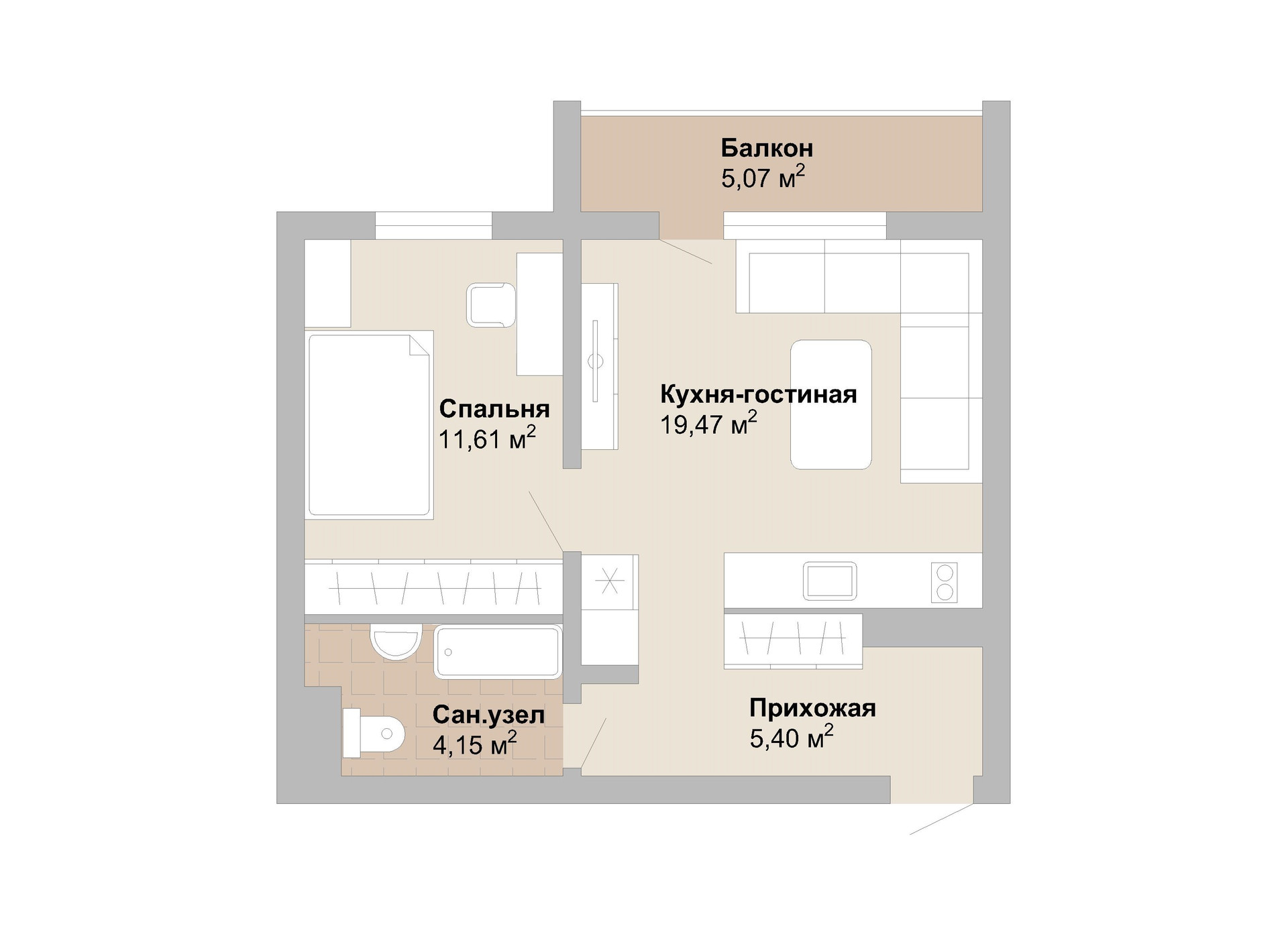 Общая площадь 40.6 м2