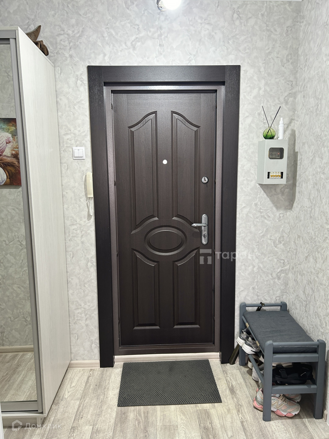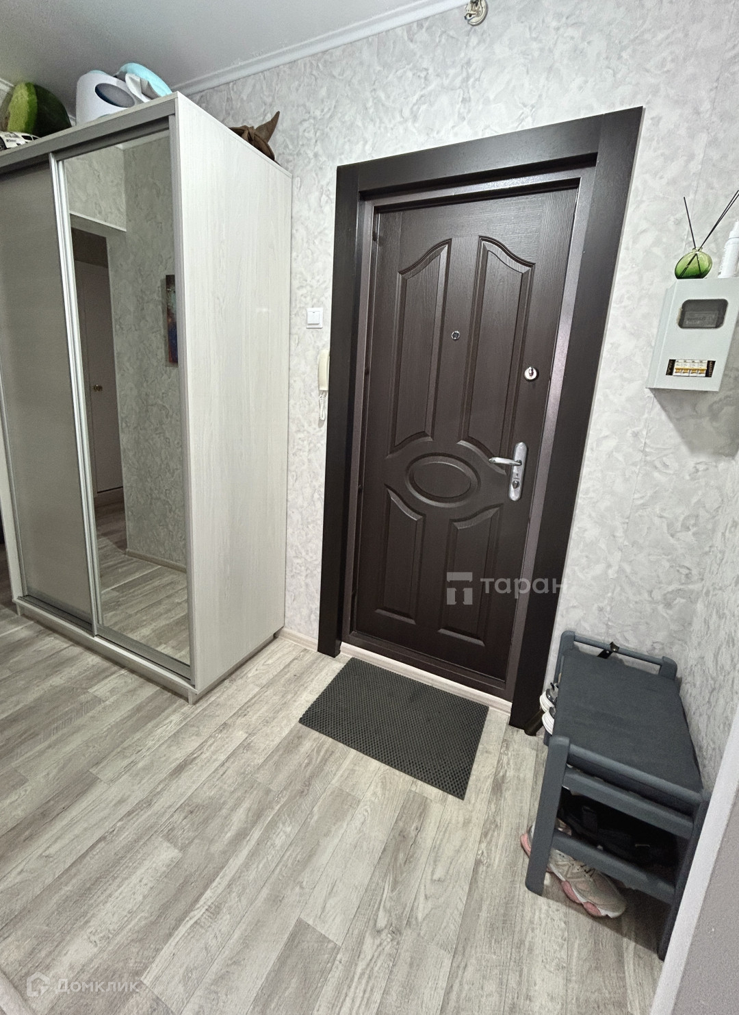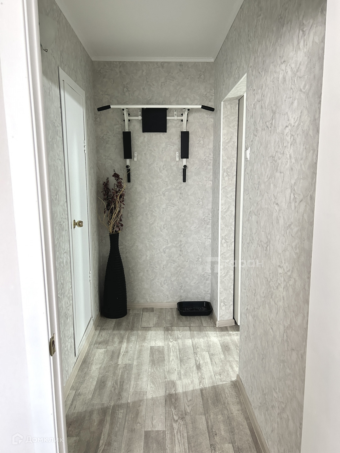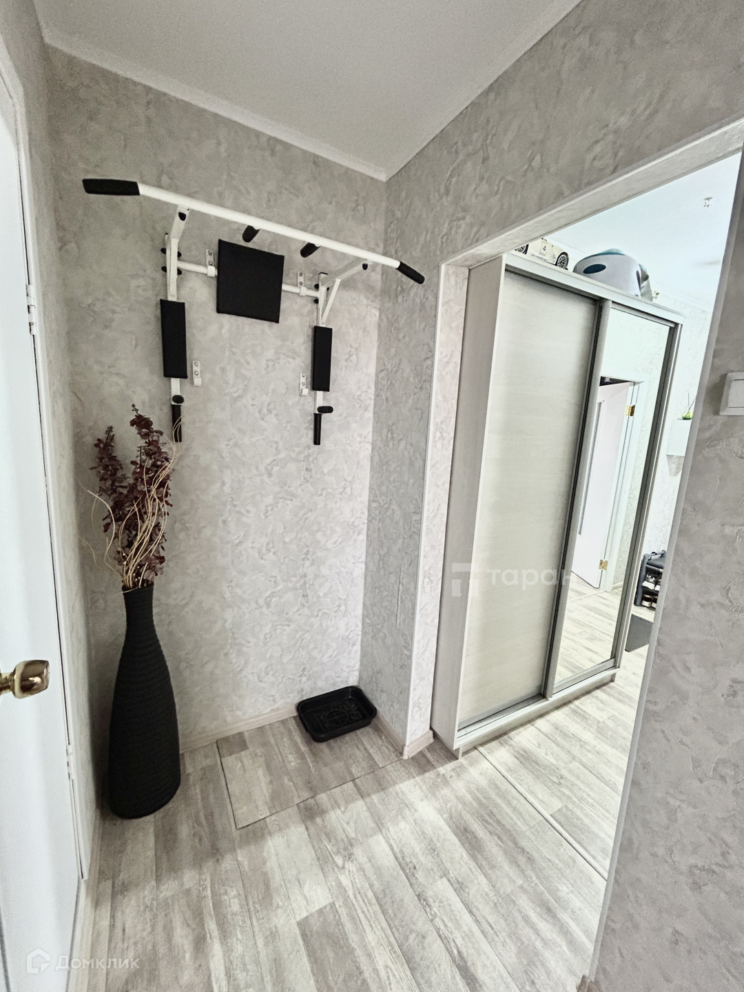 - Коридор: Большой шкаф-купе с зеркалом, турник-брусья, пуфик с обувницей.