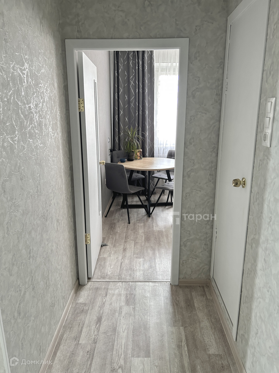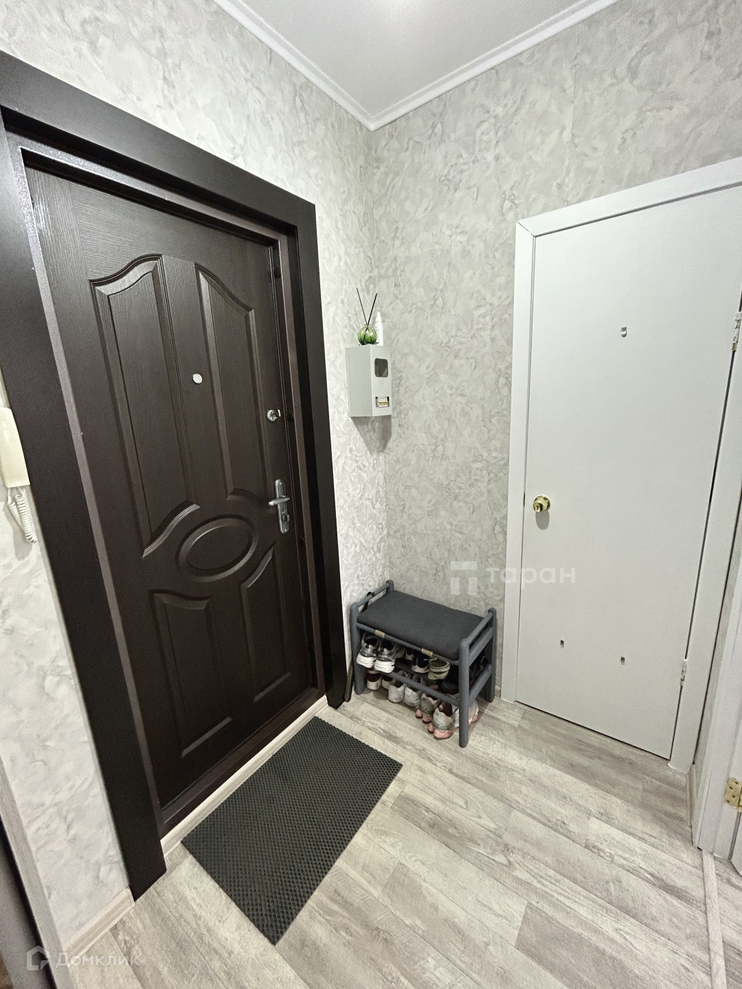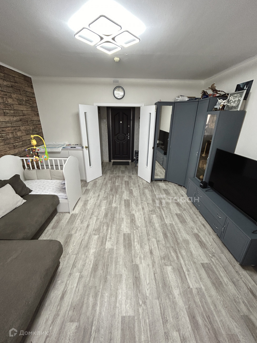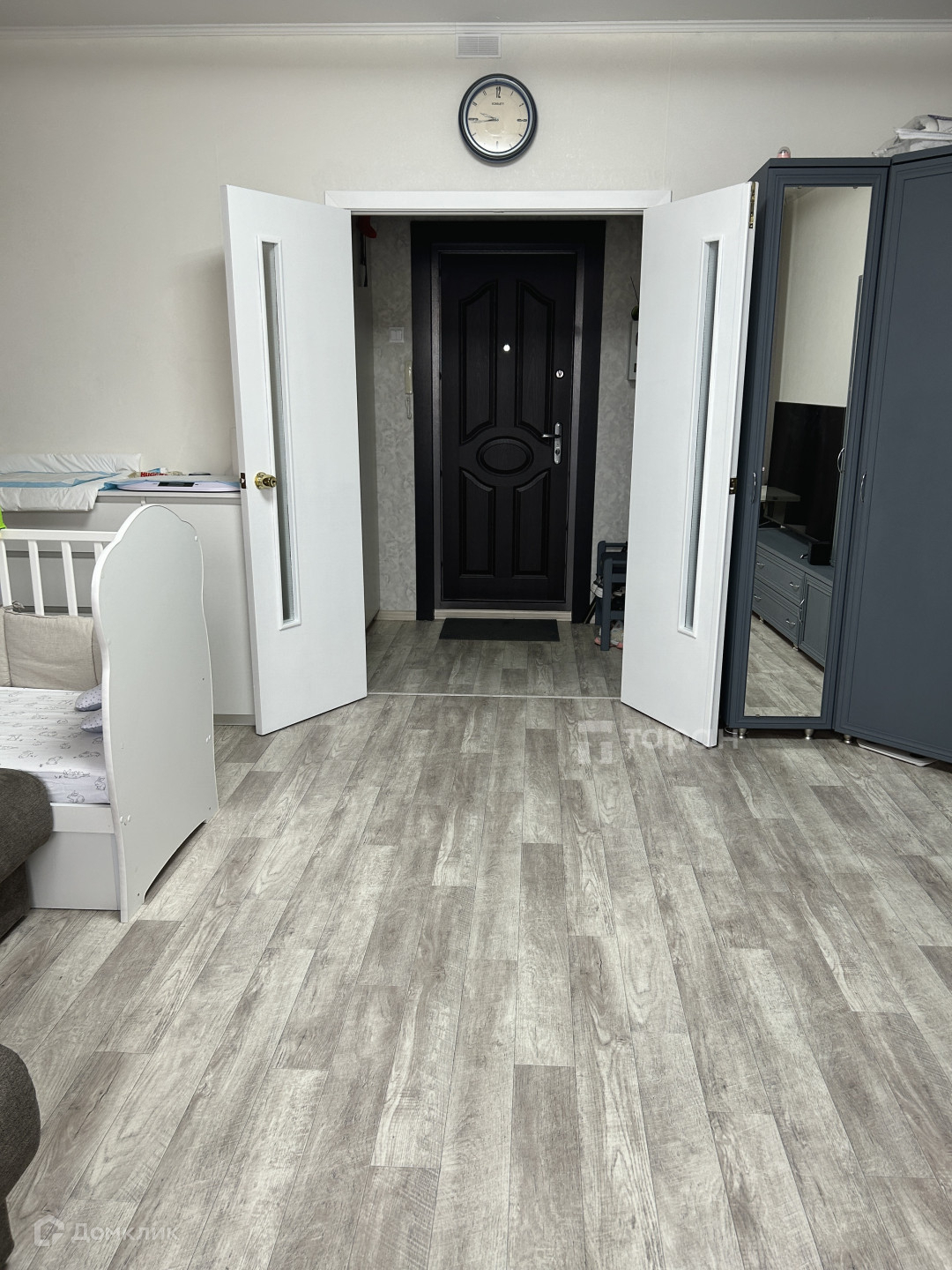- Коридор: Большой шкаф-купе с зеркалом, турник-брусья, пуфик с обувницей.
