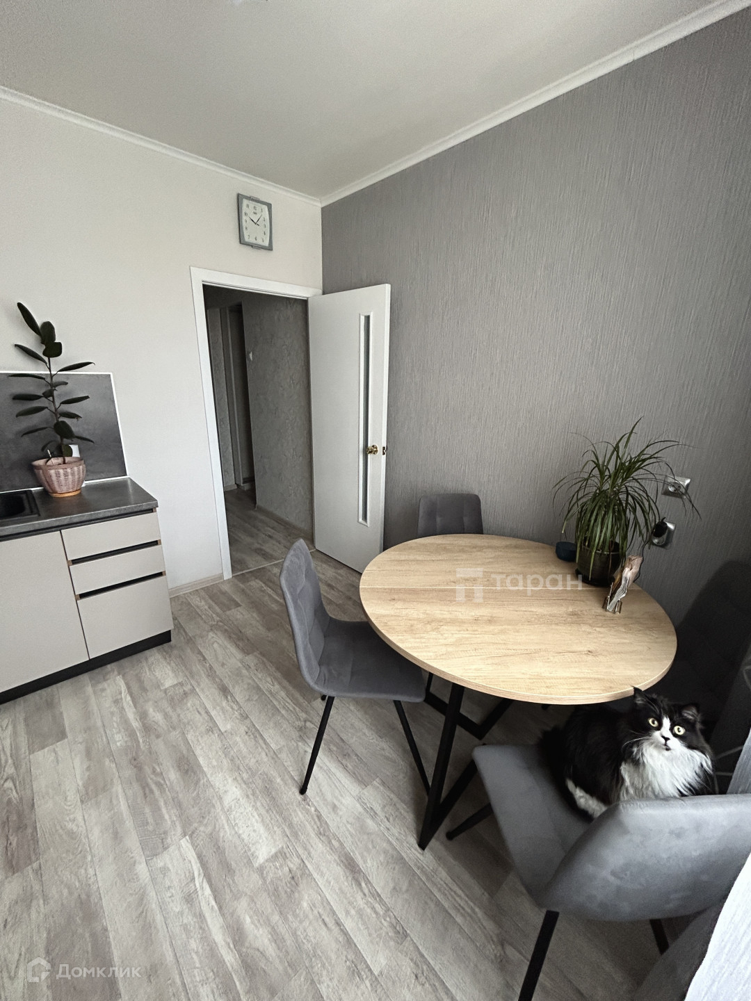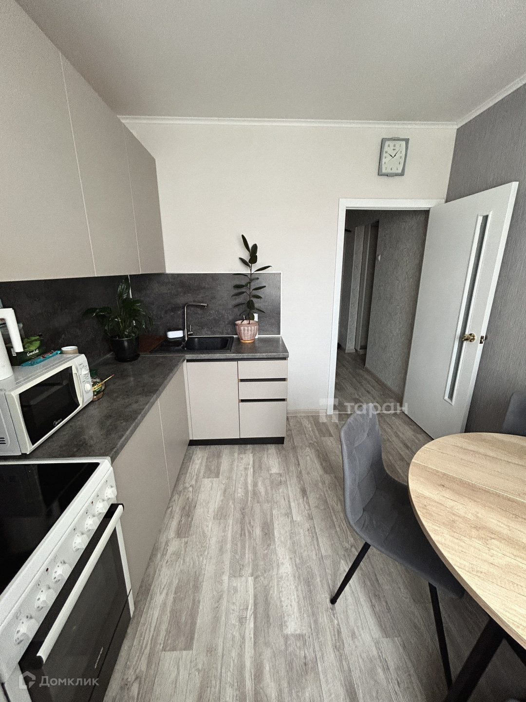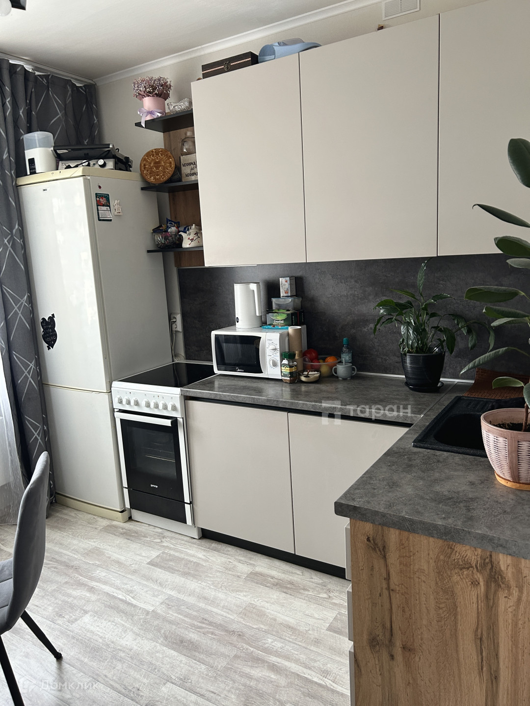 - Кухня: Дорогой кухонный гарнитур с качественными доводчиками и каменной раковиной, варочная панель с духовым шкафом (электроплита), холодильник, шторы блэкаут и тюль.