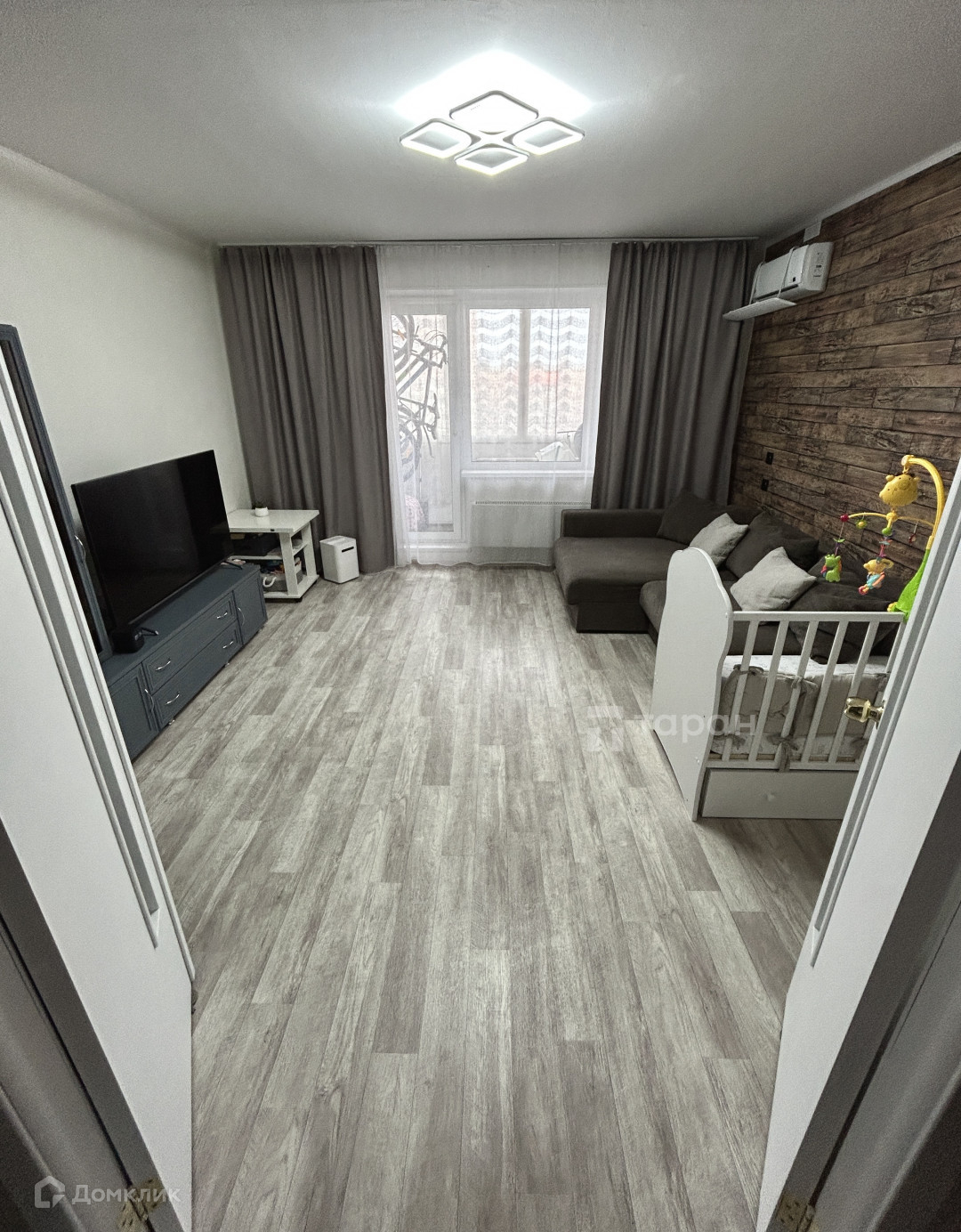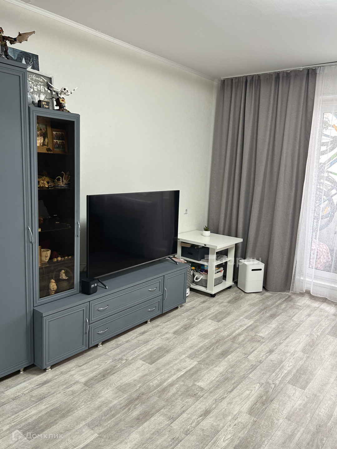 - Спальня: Шкаф с тумбой под телевизор, кондиционер, шторы блэкаут и тюль.