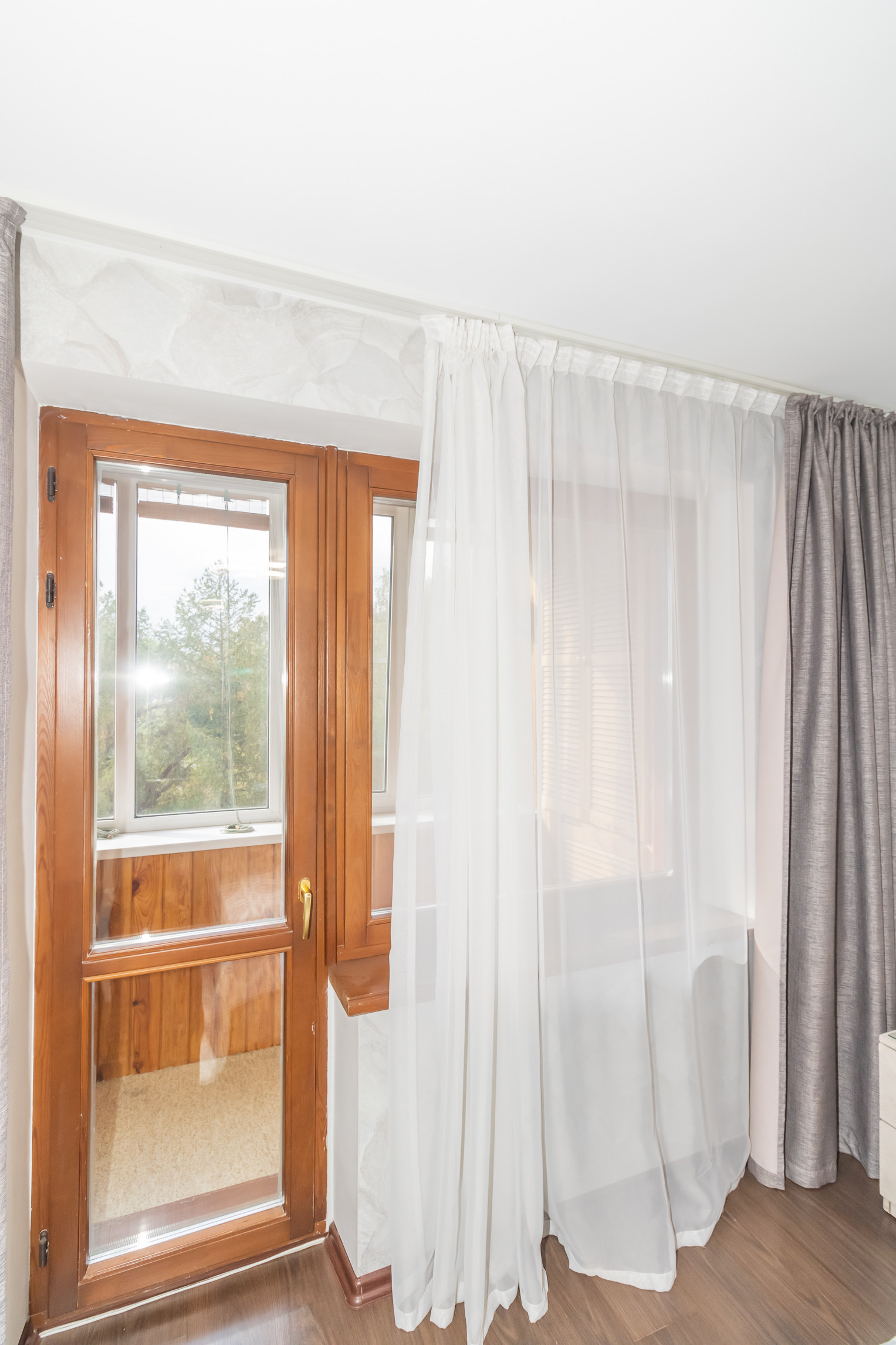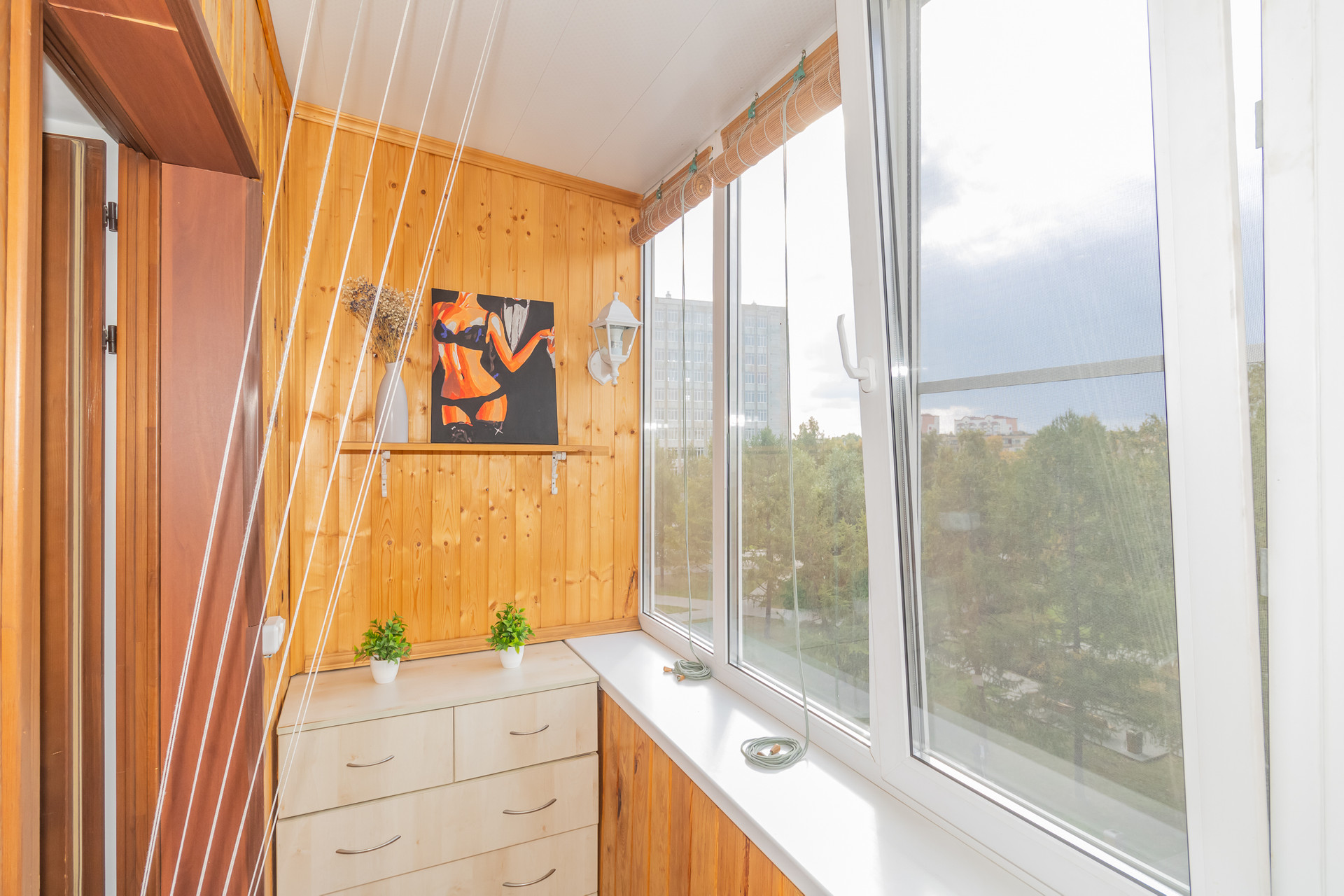 - БЛАГОУСТРОЕННАЯ лоджия. Двойной (зимний) стеклопакет. Отделка – дерево. Проведено освещение: 2 уютных бра на стене. В торце устроен шкаф под хранение.