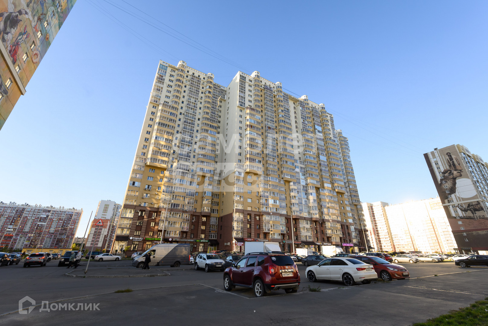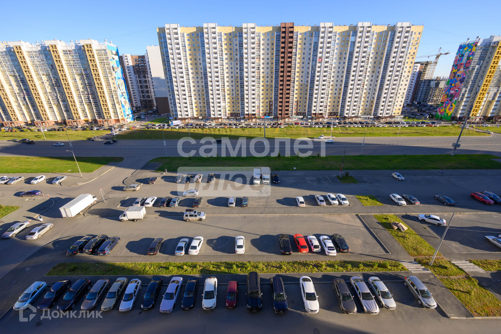Придомовая территория представляет собой просторную парковку с большим количеством мест для транспорта.