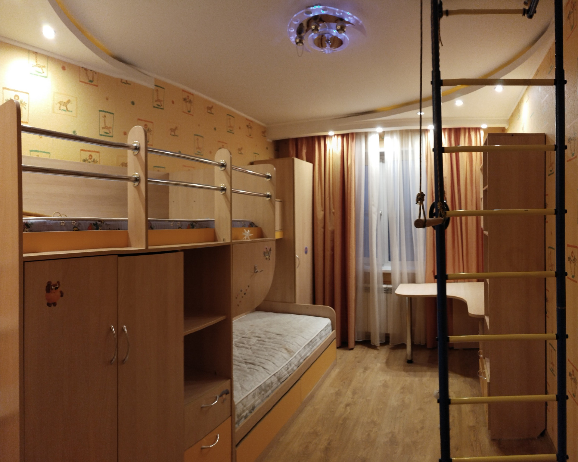 Детская комната: многоуровневый потолок из гипсокартона, ламинат, полностью оборудована всей необходимой мебелью: детские кровати для 2 детей, шведская стенка, стол, шкафы.