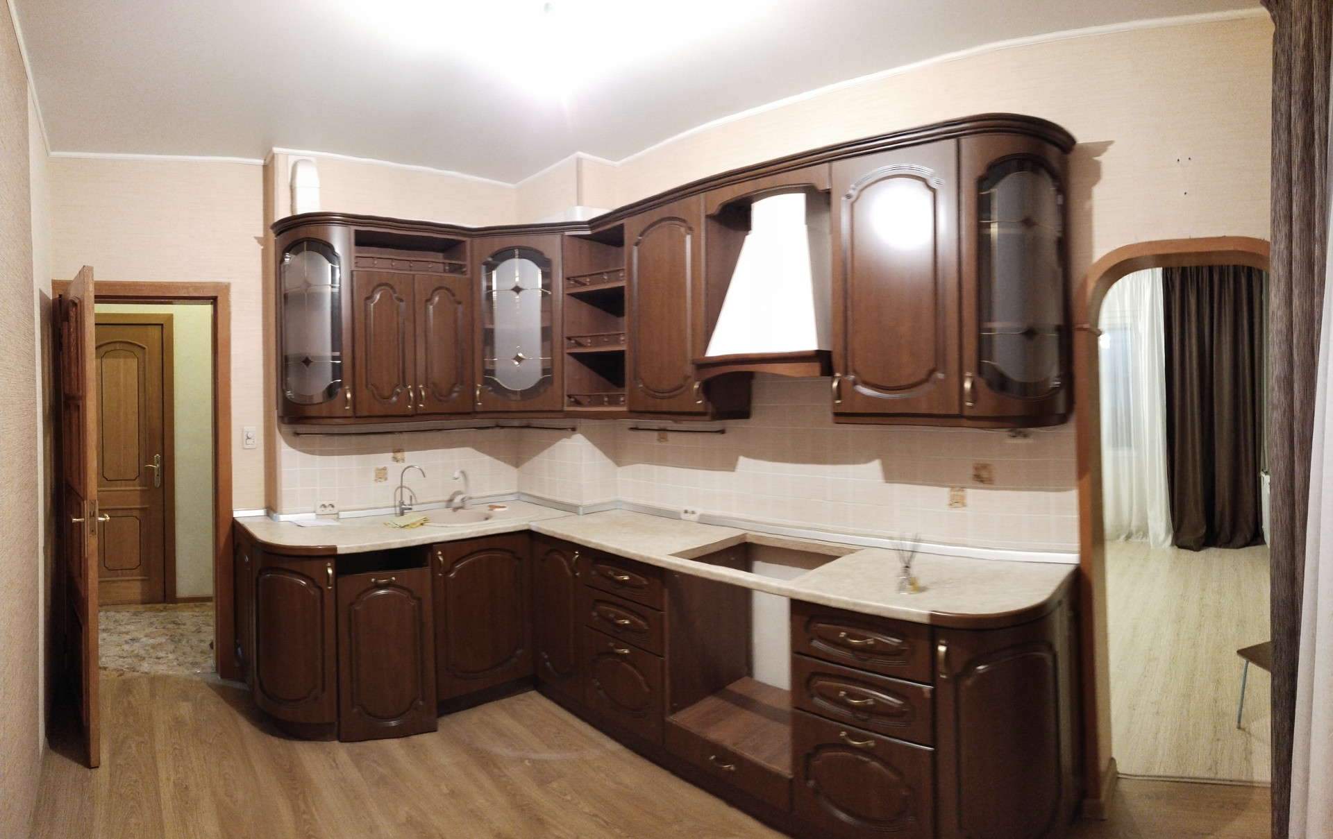 Кухня: качественный гарнитур, вытяжка, ламинат, балкон.