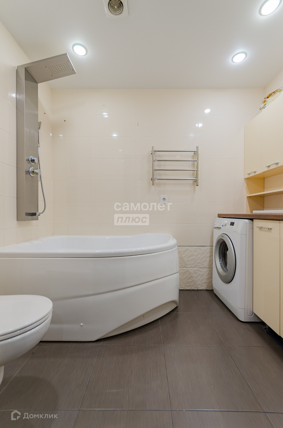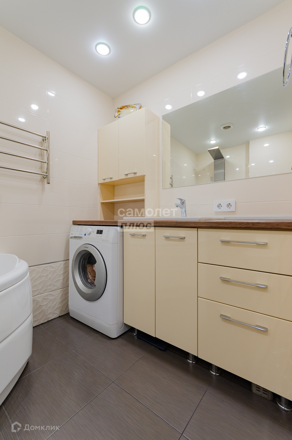 Санузел совмещенный, в красивом, стильном кафеле. Удобная столешня с раковиной, где есть место под стиральную машину.