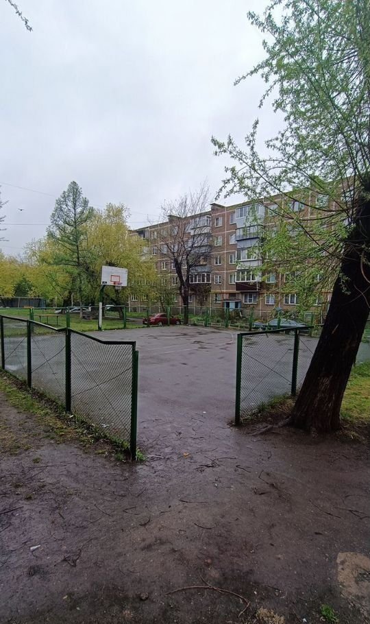 Двoр с баскетбольной площадкой и игровой зоной для малышей.