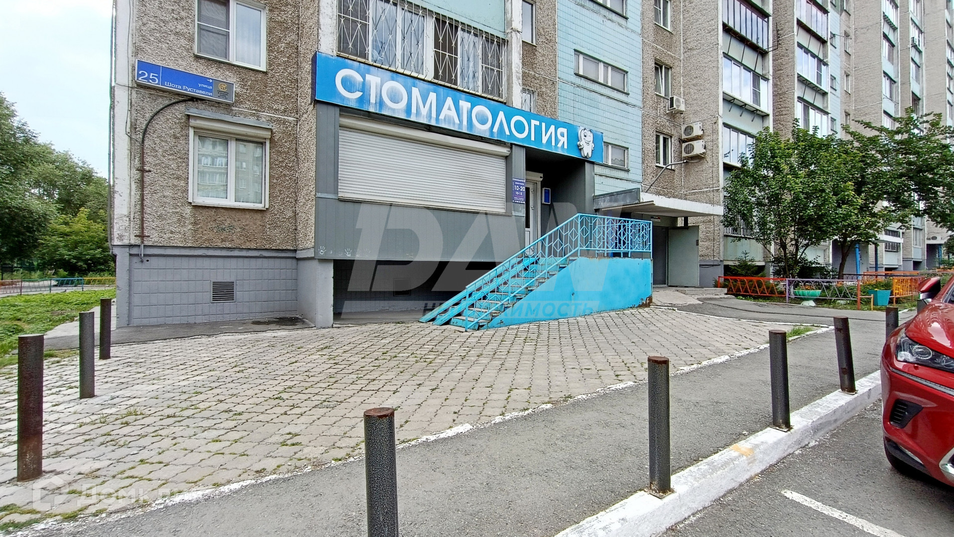 Огороженная территория. Рядом просторная парковка.