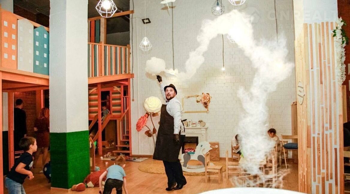 Большое пространство для активных игр, различные игрушки, детская кухня, бизибордный  домик, двухуровневый городок выполненный из натурального дерева, с тоннелем, элементами скалодрома, горкой и сухим бассейном, а на втором уровне  комната-чердак с телевизором, где можно отдохнуть и поиграть в Х-бокс.