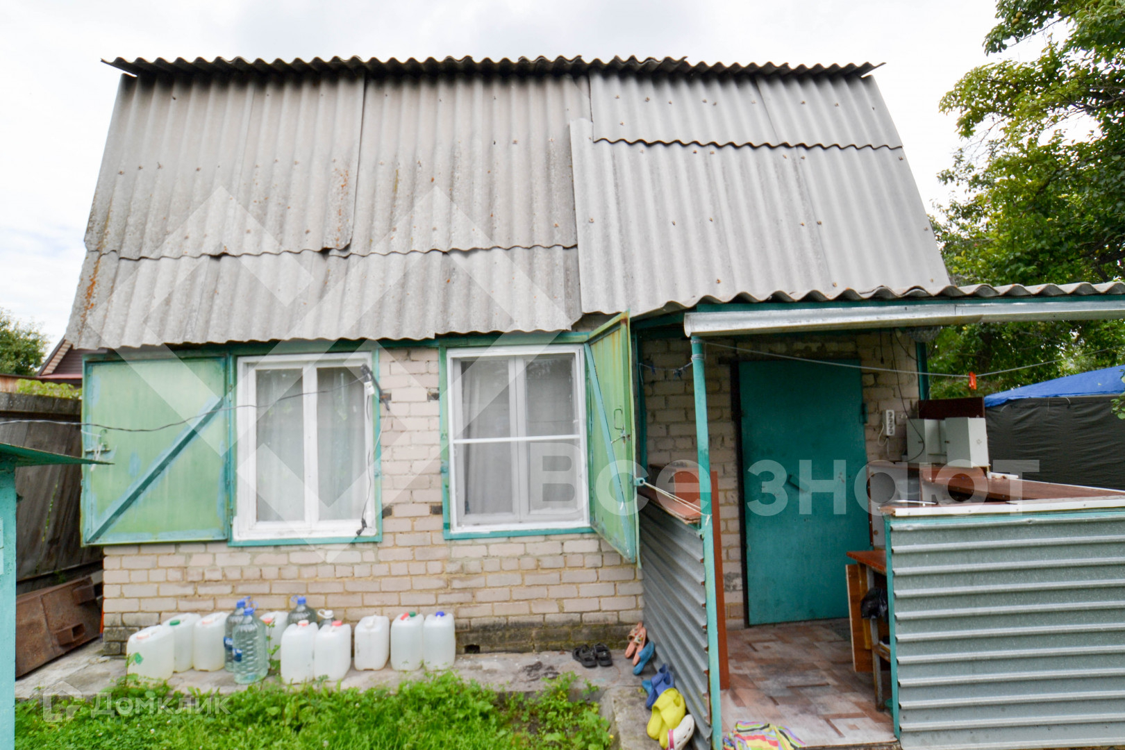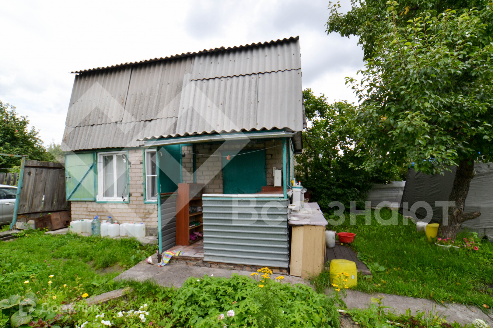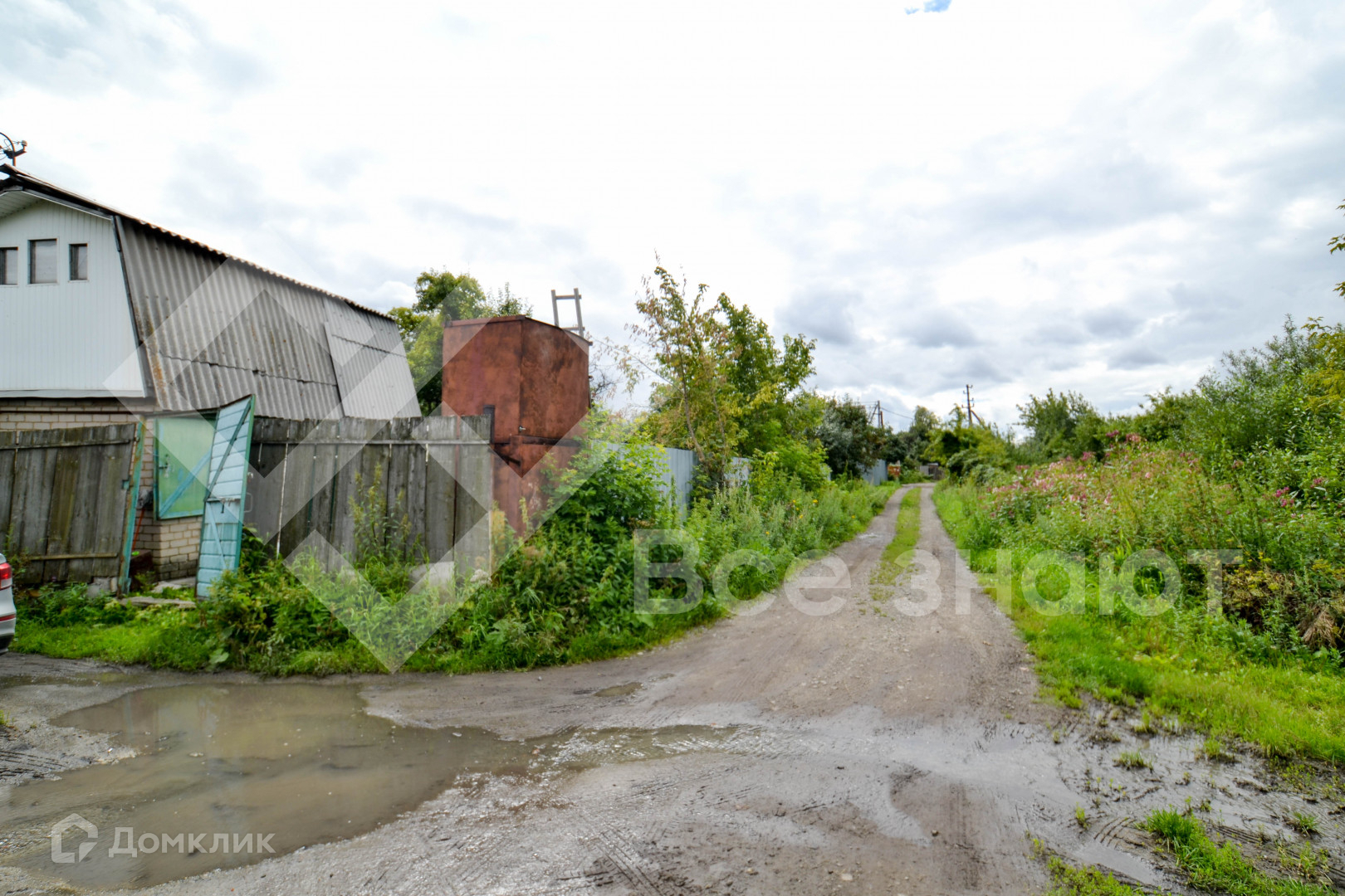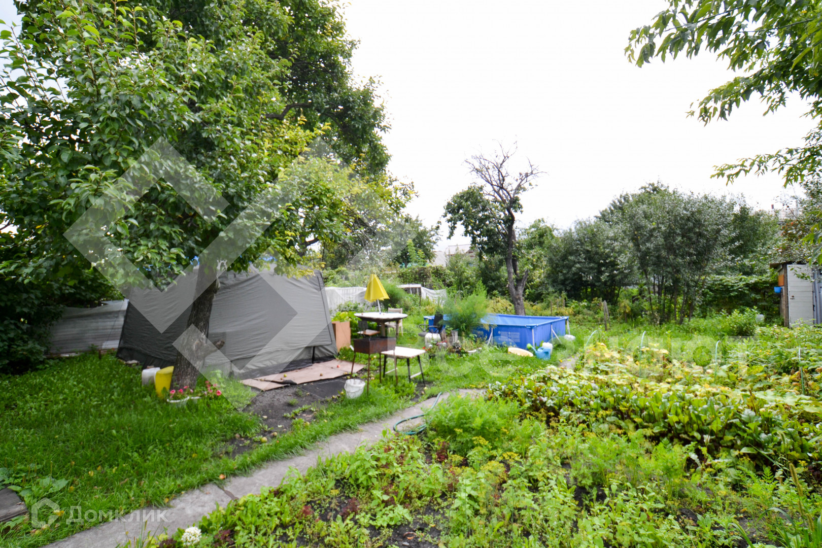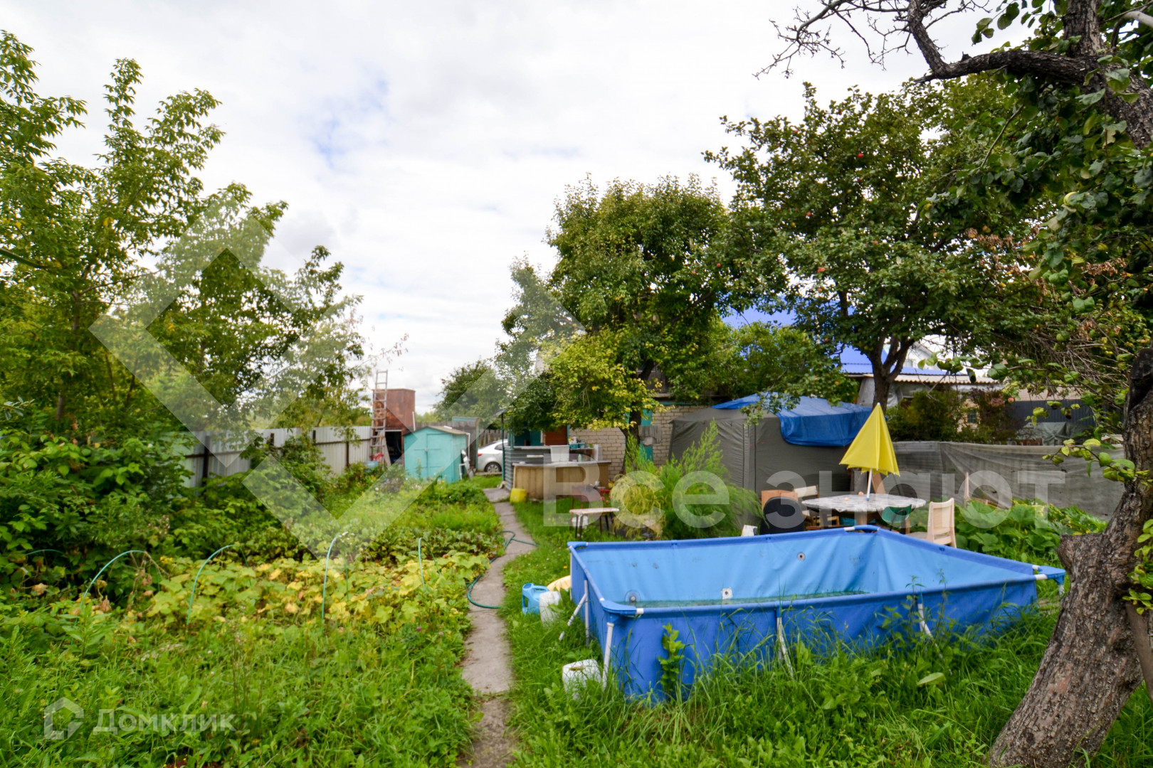 На участке плодовые деревья и кустарники: яблони, смородина, груша, малина, клубника, крыжовник, гpядки, дорoжки , бак для воды.