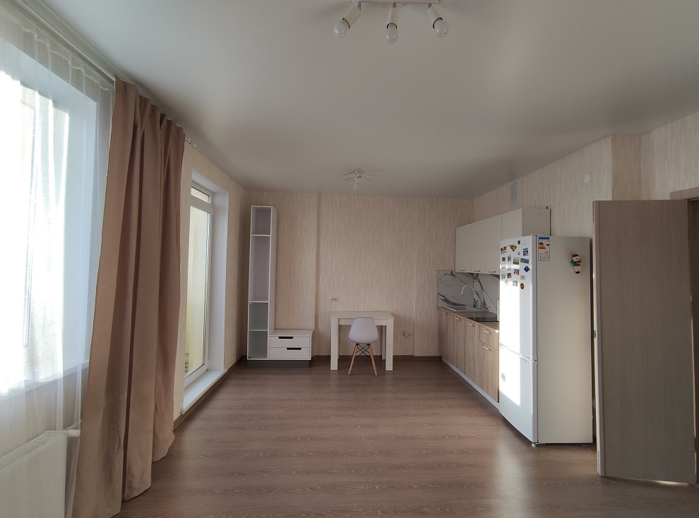 Кухня-гостиная  с двумя окнами 19 квадратных метров., большой санузел и просторный коридор.