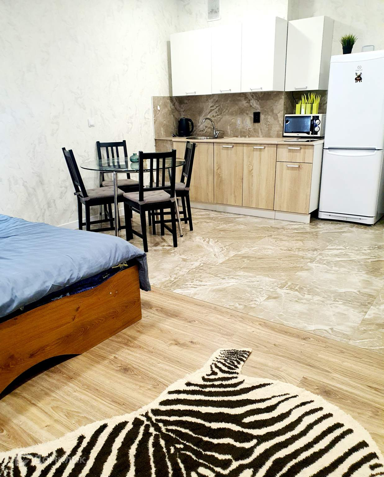 - жилая зона с двуспальной кроватью с ортопедическим матрасом, светильниками, есть smart tv;