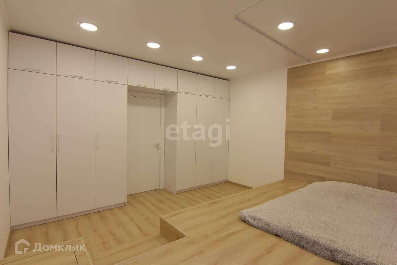 В спальне подиум, матрас, шкаф. В подиуме у изголовья сделаны потайные шкафчики, в которых располагаются розетки и есть место для хранения.
