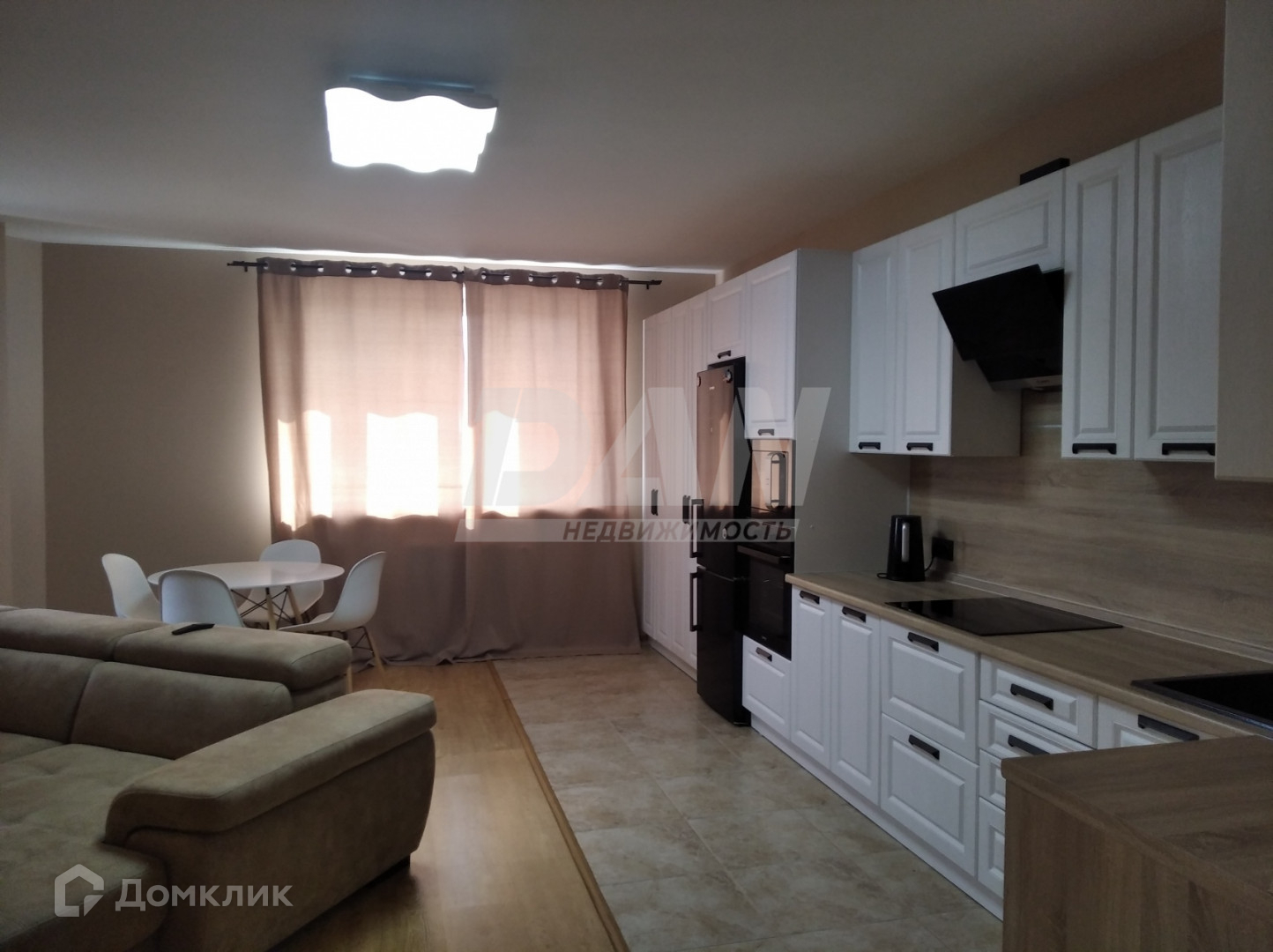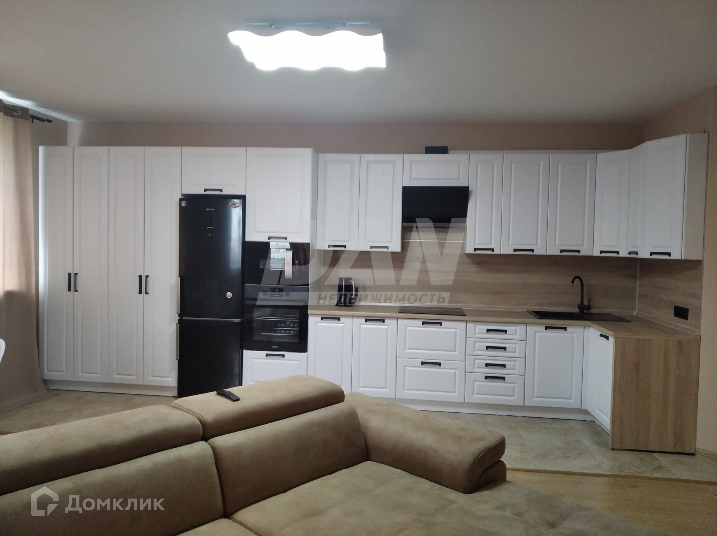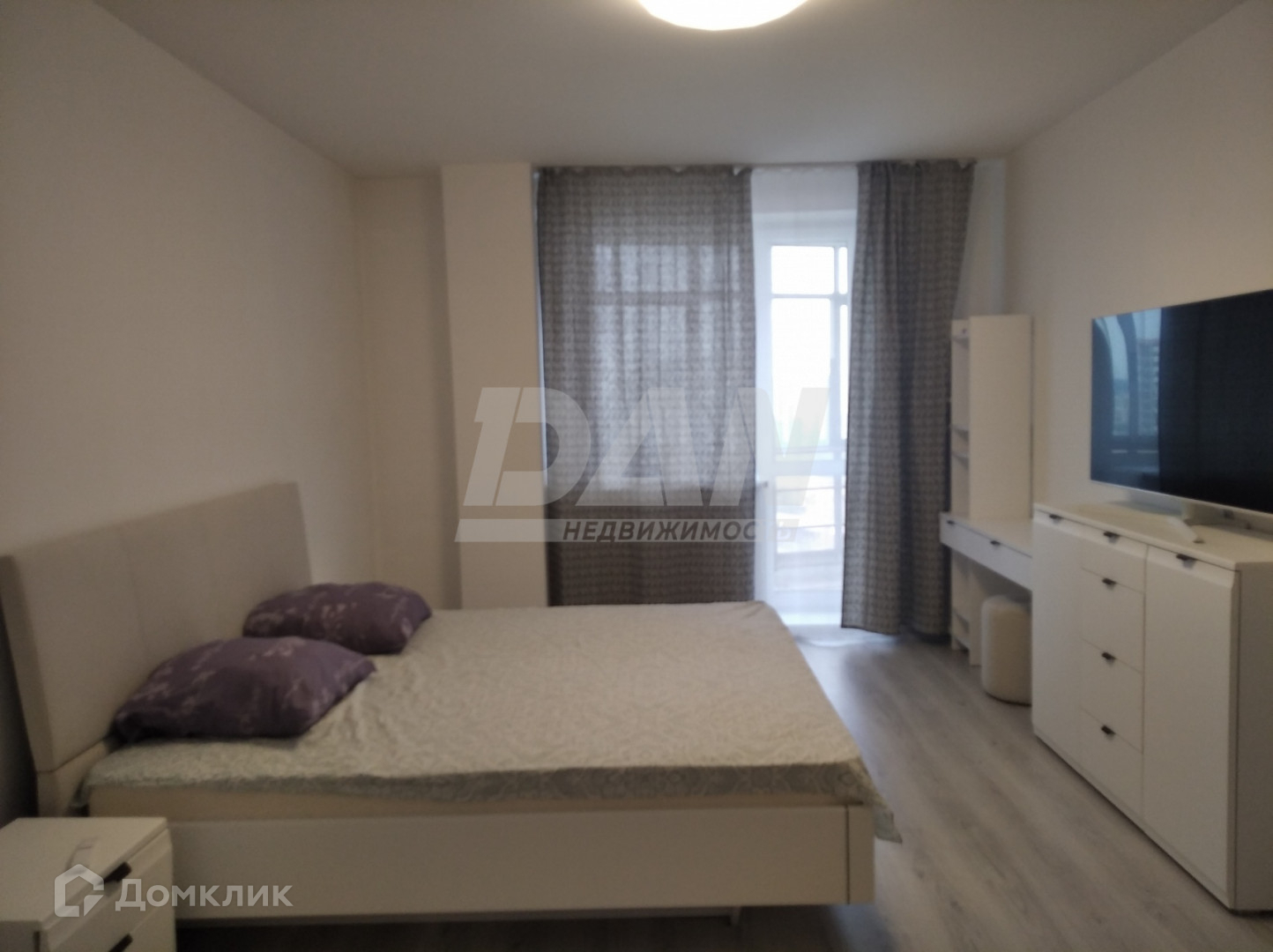 В квартире есть кухонный гарнитур с необходимой техникой, два телевизора: в студии и одной из спален. Во второй спальне - детская.