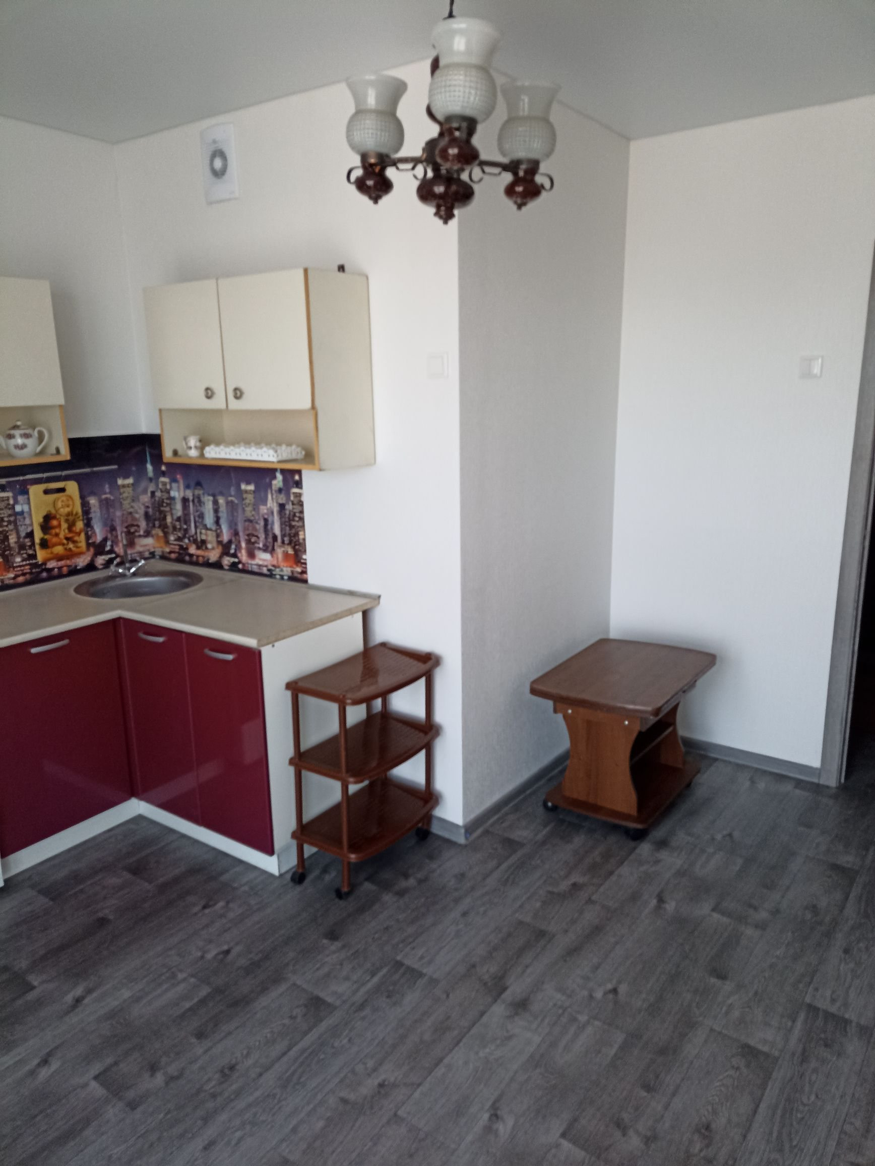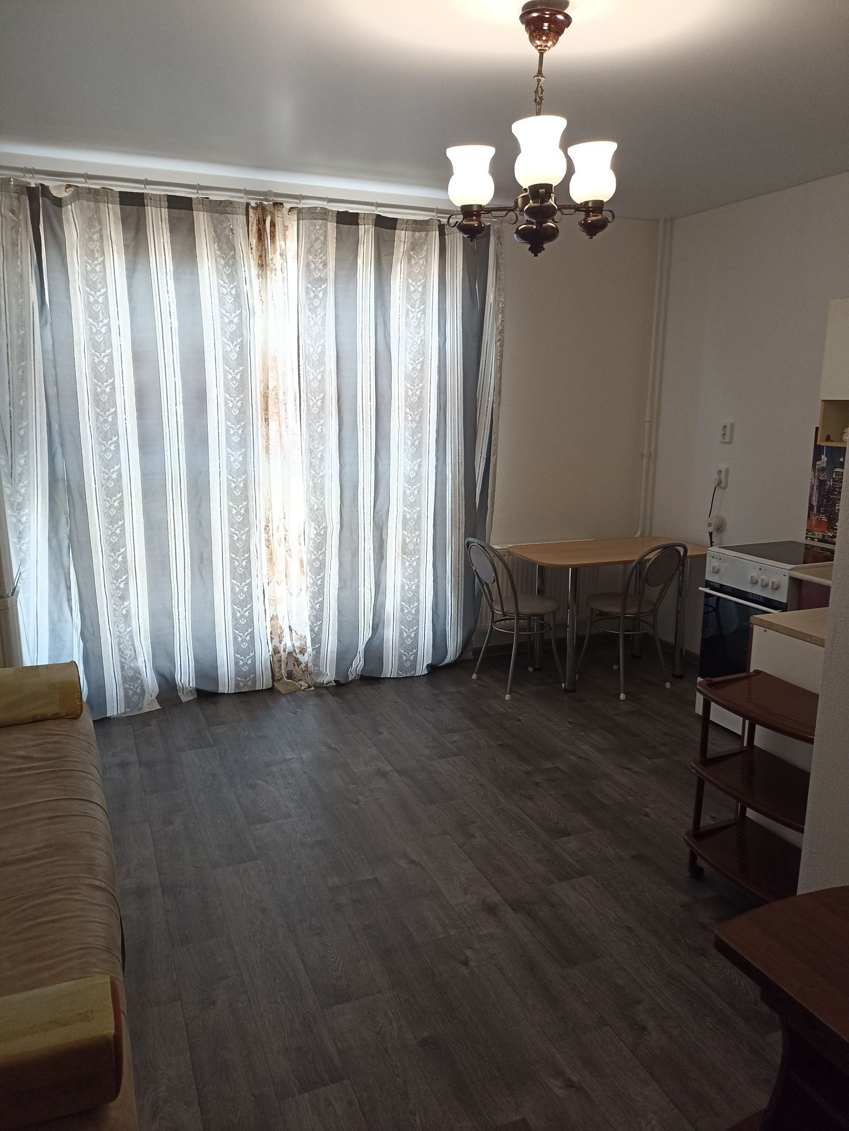Есть вся мебель (диван, стол, стулья, кухонный гарнитур, шкафы) и техника (стиральная машина, стеклокерамическая электроплита, холодильник),  сантехника, шторы.