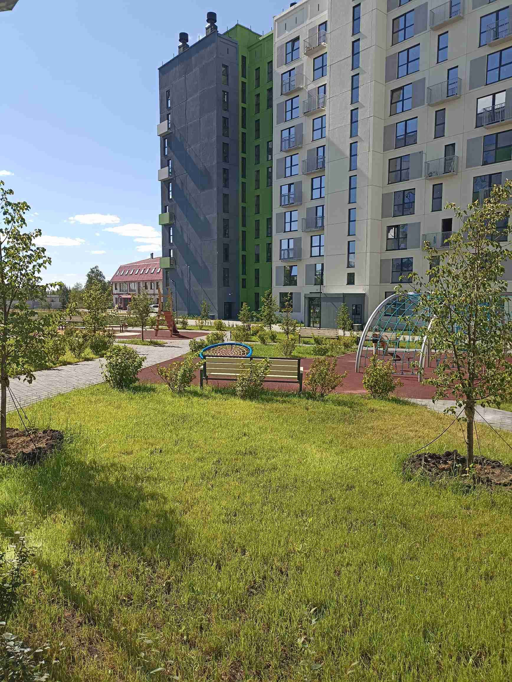 Закрытая территория, большая парковка, благоустроенный двор, прямо от дома ходит бесплатный автобус по расписанию.