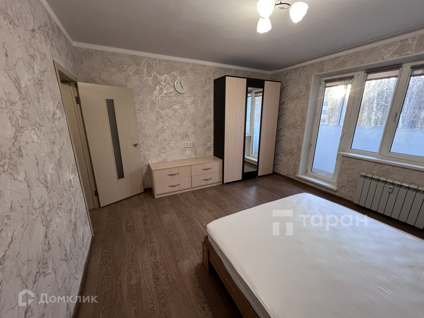 Комната 18м2, с выходом на балкон, в комнате кровать с ортопедическим матрасом, прикроватные тумбы, комод, шкаф. На окнах есть рулонные шторы, на балконе линолеум, стены окрашены, есть стол и стулья.