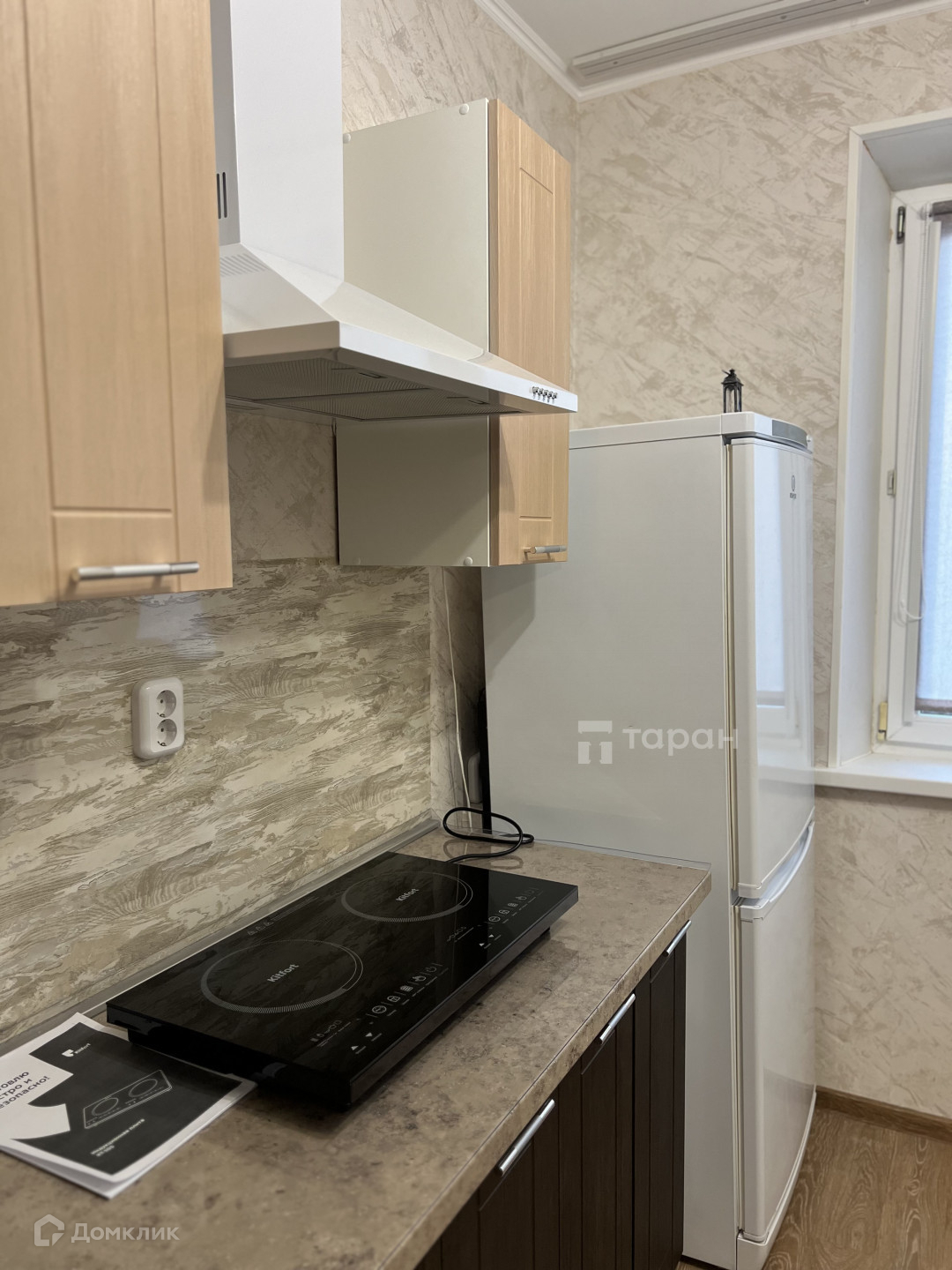 Кухня 9м2, на кухне гарнитур, холодильник, стол и стулья, вытяжка, индукционная плита.