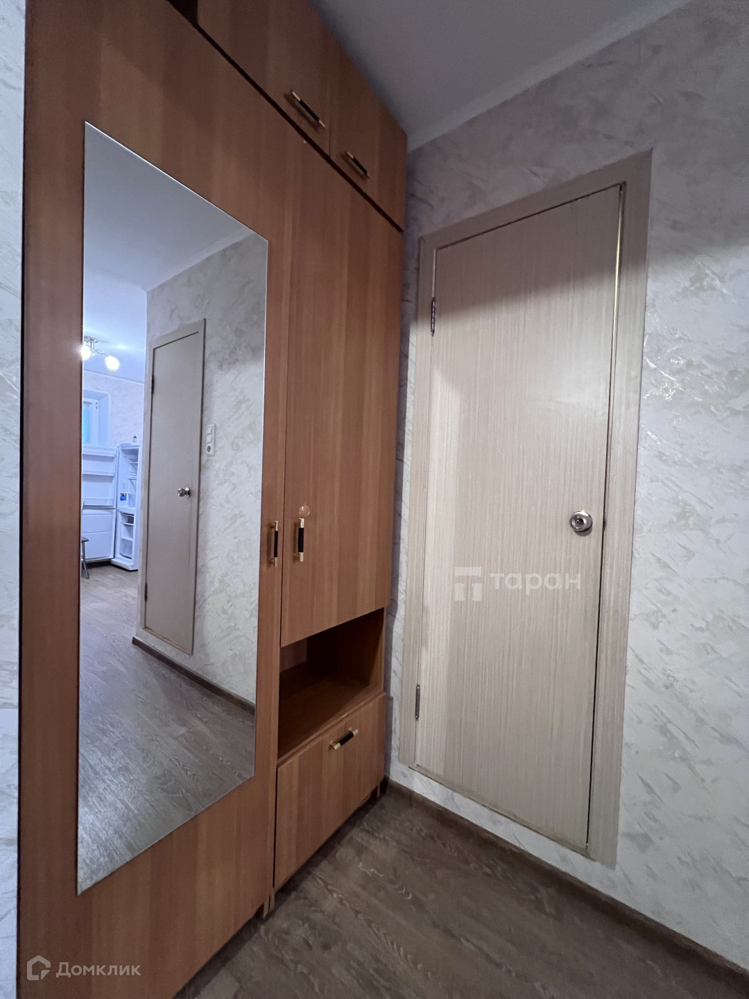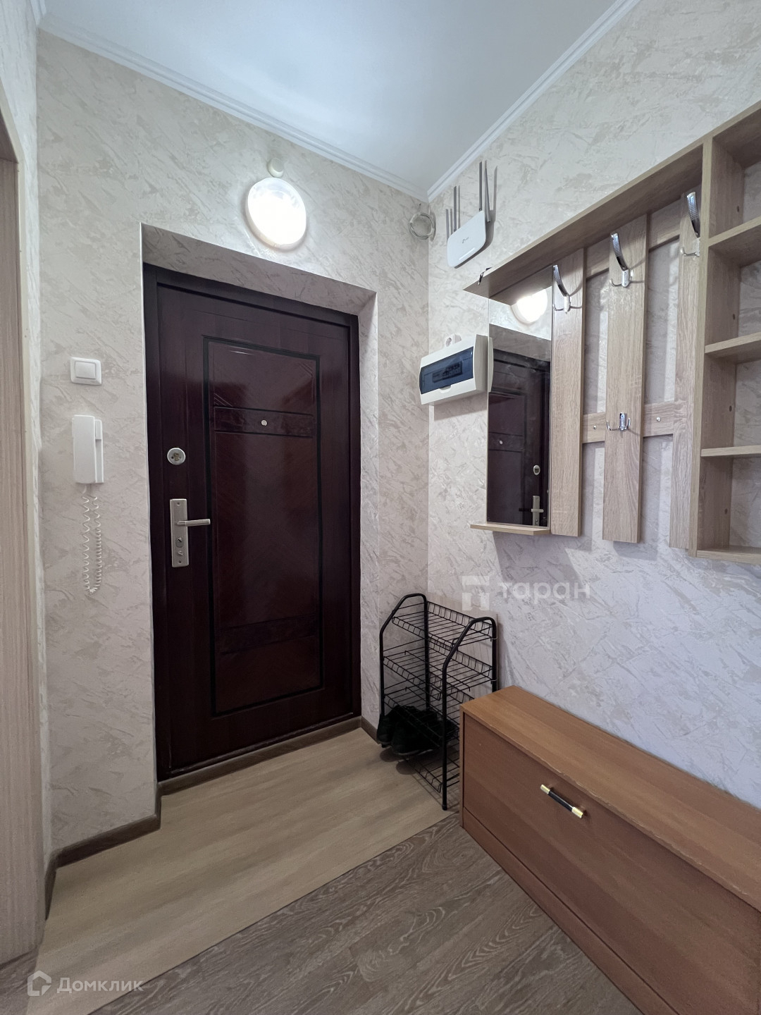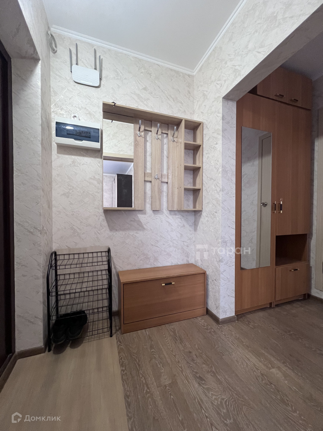 В прихожей есть обувница, вешалка для одежды и шкаф.