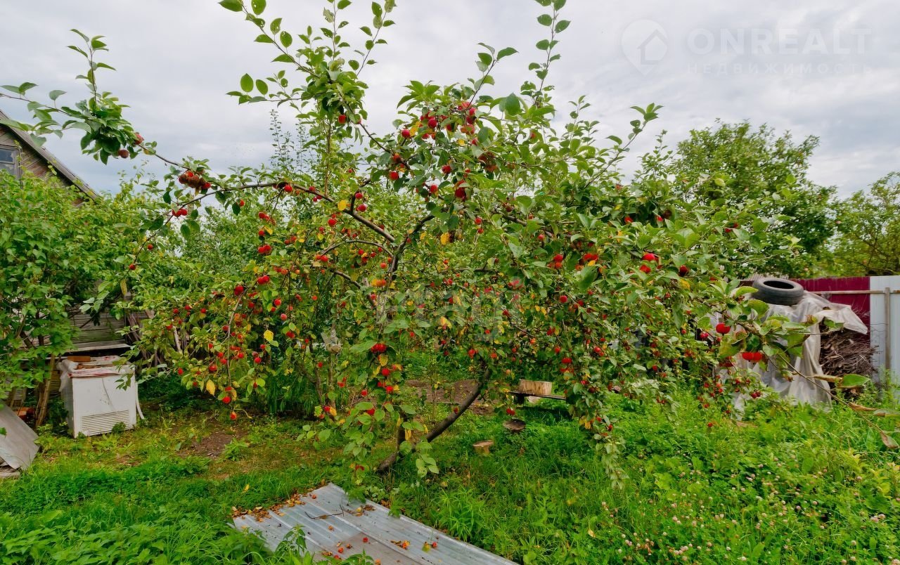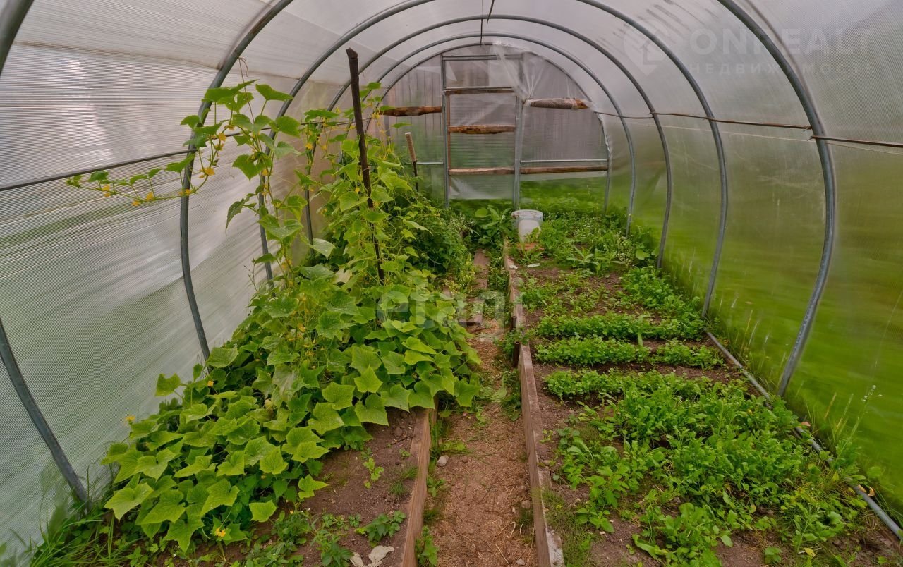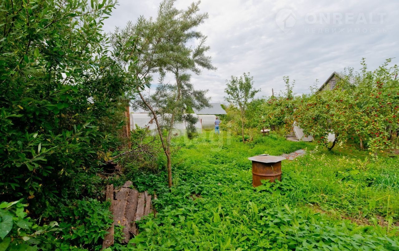 На участке много плодово-ягодных деревьев и кустарников, теплица и хозпостройки, организовано место для стоянки автомобиля.