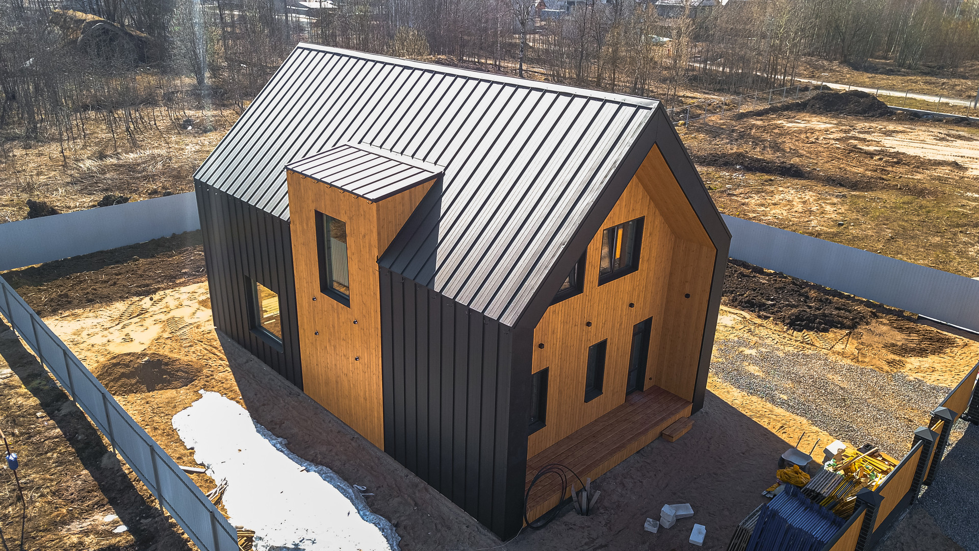 Конструктив дома : фундамент - монолитная плита; стены газобетон с утеплением 100 мм, оштукатурены; кровля - утепление 350 мм, материал- клик фальц грандлайн, с покрытием DRAP; фасад комбинированный - клик фальц и деревянные рейки.